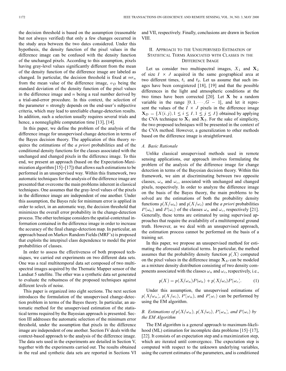 本文分为八个部分。下一节将介绍贝叶斯理论中无监督变化检测问题的表述。特别是,提出了一种用于无监督估计贝叶斯方法所需的统计项的自动方法。在假设差异图像中的像素彼此独立的情况下,第III部分解决了自动选择最小误差阈值的问题。第四部分讨论了基于上下文的差异图像分析方法。第V部分详细介绍了实验中使用的数据集以及所进行的实验。在实际和合成数据集中获得的结果分别在第VI节和第和VII节报告中展示出来。最后,第八节得出结论。