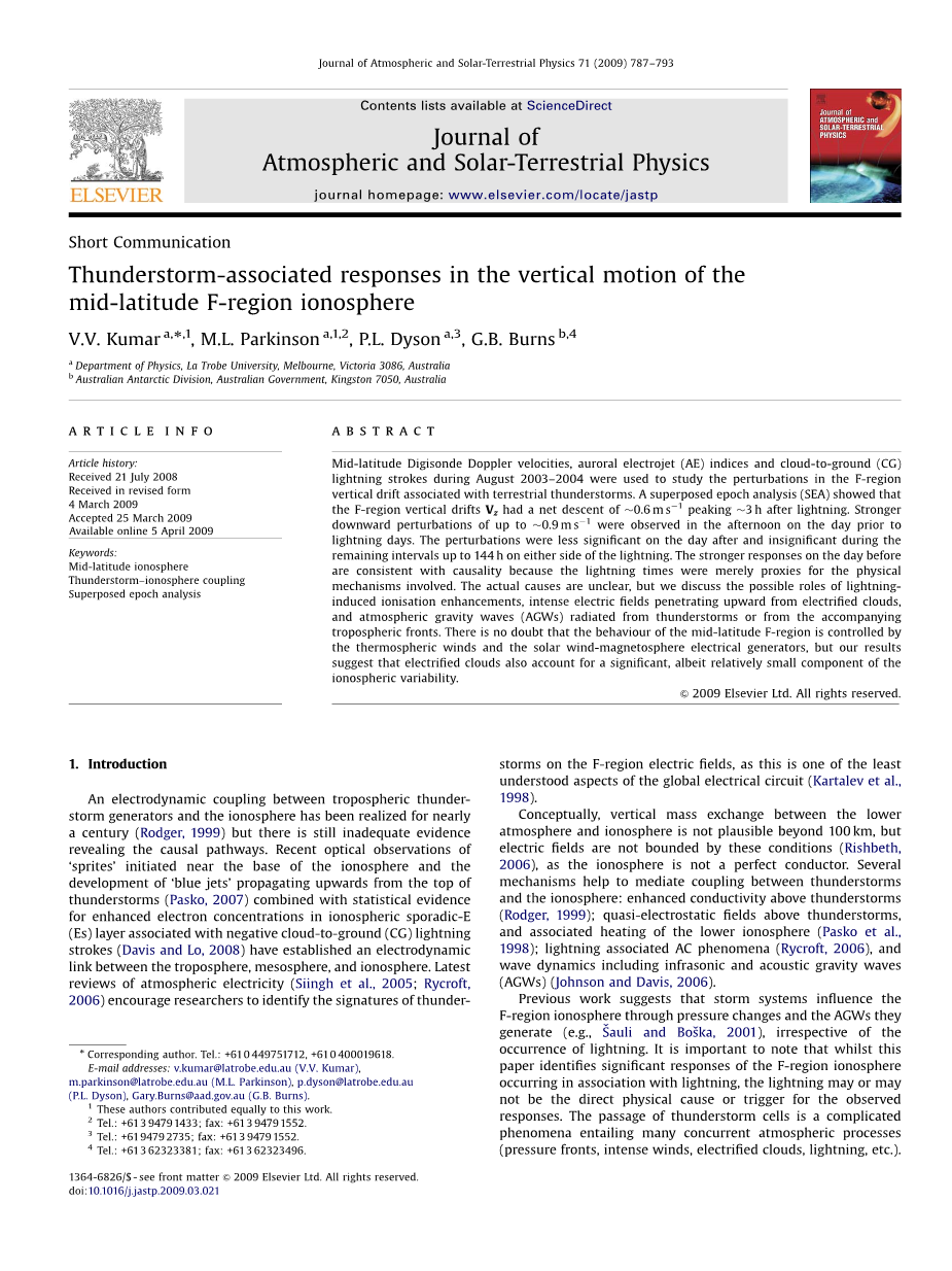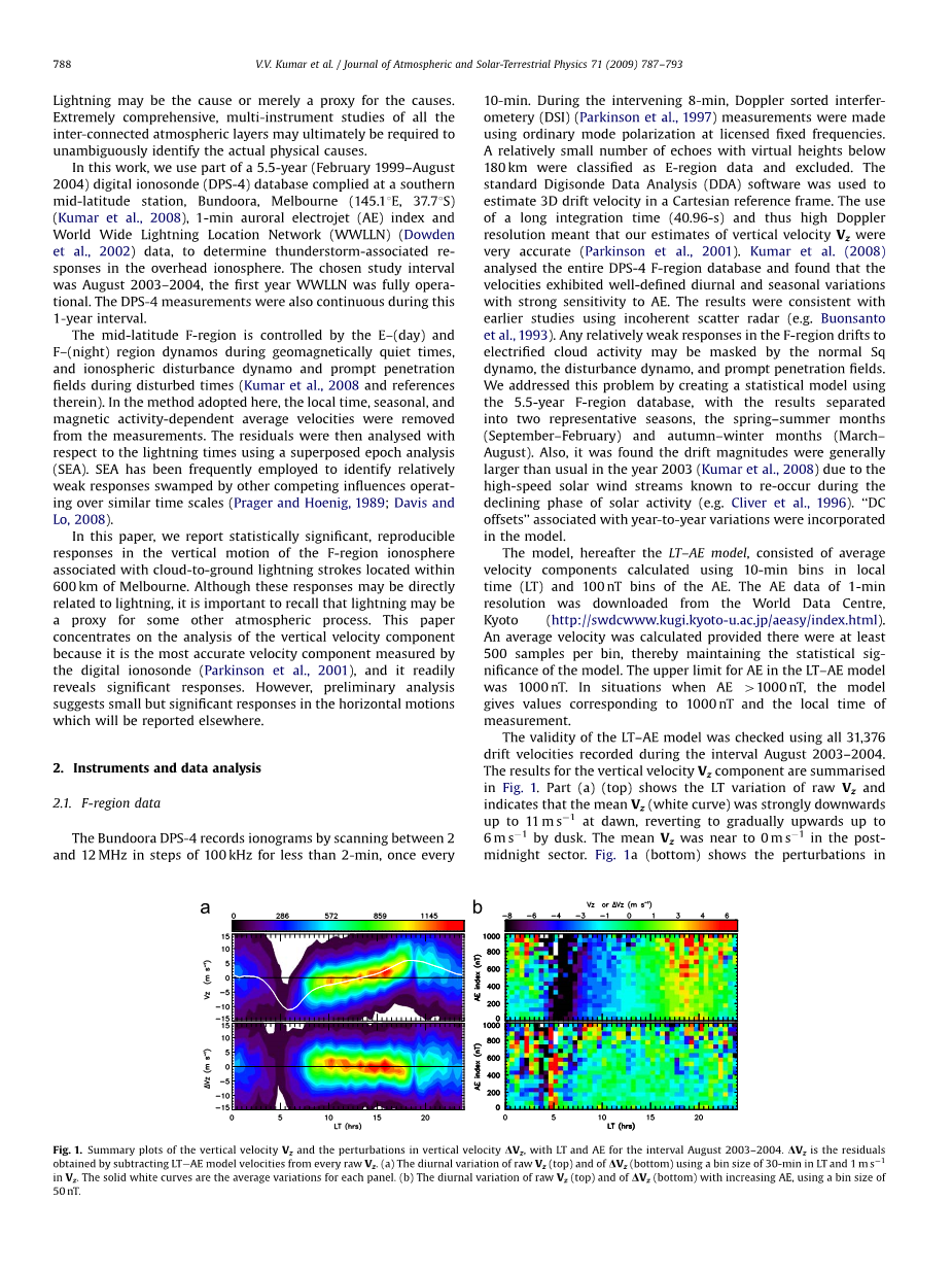 在本文中,我们的报告很显著,与云地闪电有关的在F区(电离层)的可再生的反应位于墨尔本600公里。虽然这些反应可能直接关系到闪电,重要的是要记得,闪电可能代表一些其他大气过程。本文专注于垂直速度分量的分析,因为它是最准确的速度分量的数字探测仪(Parkinso等等,2001),它容易显示显著的反应。然而,初步分析表明小但重要的反应在水平运动将报道。