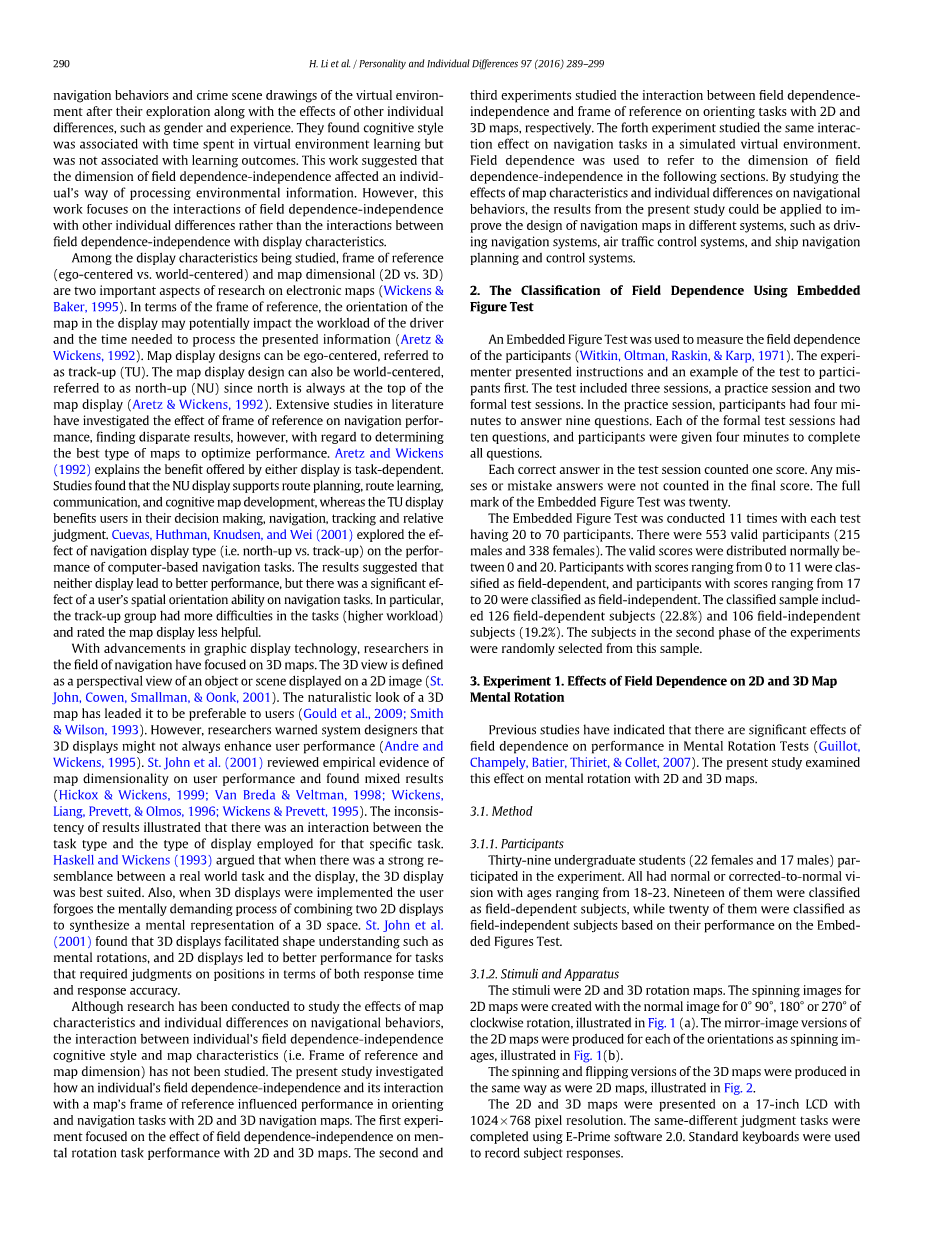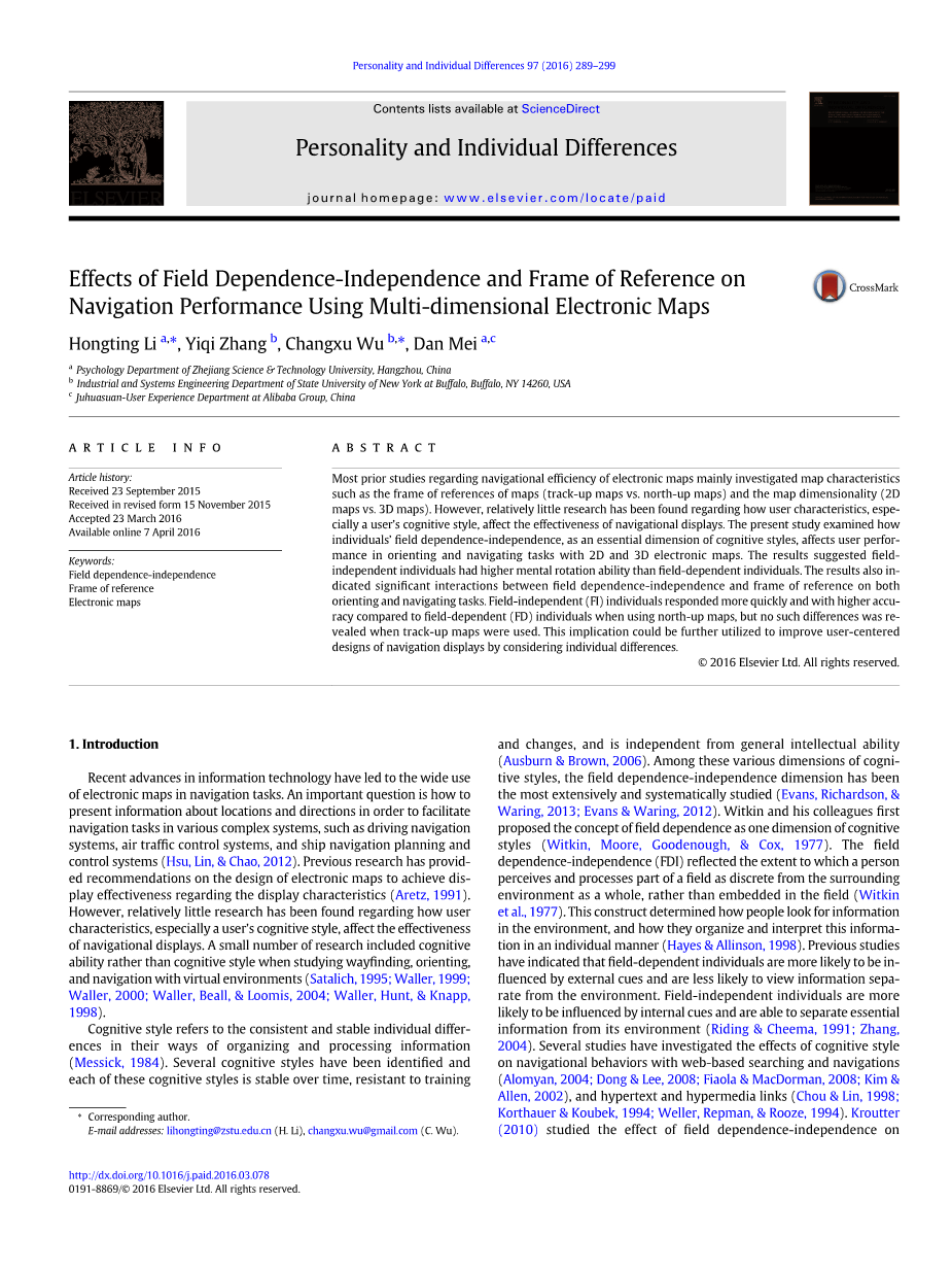 信息技术的最新进展导致电子地图在导航任务中的广泛使用。一个重要的问题是如何呈现有关位置和方向的信息,以促进各种复杂系统中的导航任务,例如驾驶导航系统、空中交通控制系统和船舶导航规划和控制系统(Hsu,Lin,amp;Chao,2012)。以前的研究提供了有关电子地图设计的建议,以实现有关显示特性的显示效果(Aretz,1991)。F:论文jskjdx2022\_bookmark18然而,关于用户特征,尤其是用户的认知风格如何影响导航显示的有效性的研究相对较少。在研究虚拟环境中的寻路、定向和导航时,少数研究包括认知能力而不是认知风格F:论文jskjdx2022\_bookmark29F:论文jskjdx2022\_bookmark29F:论文jskjdx2022\_bookmark29