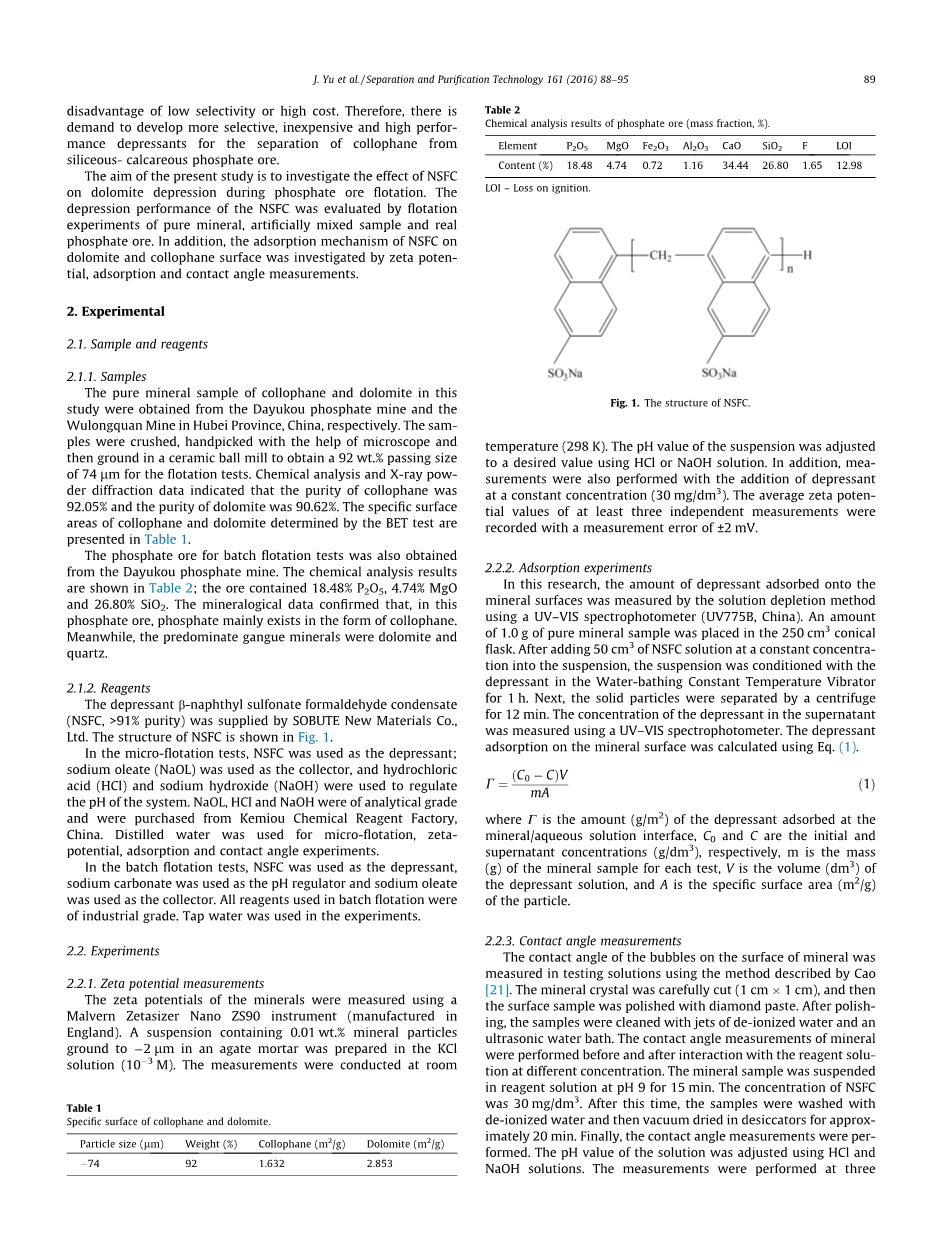 本研究的目的是探讨NSFC在磷酸盐矿石浮选中对白云石抑制效果。NSFC的抑制效果是通过对纯矿物、人工混合试样和真正的磷酸盐矿石进行浮选试验得出来的。此外,NSFC对白云石和胶磷矿的吸附原理是通过对电动电势、吸附和接触角的测量得到的。