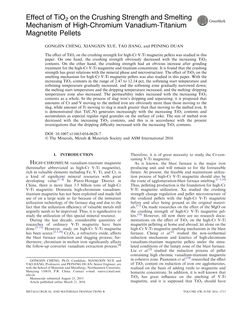 龚金成,博士研究生,陶江,教授,高级工程师,东北大学材料与冶金学院,沈阳110819,中国。联系邮箱:xuexx@mail.neu。手稿提交2015年8月23日。文章在线发表2016年3月21日。冶金与材料交易47bB卷,2016年六月