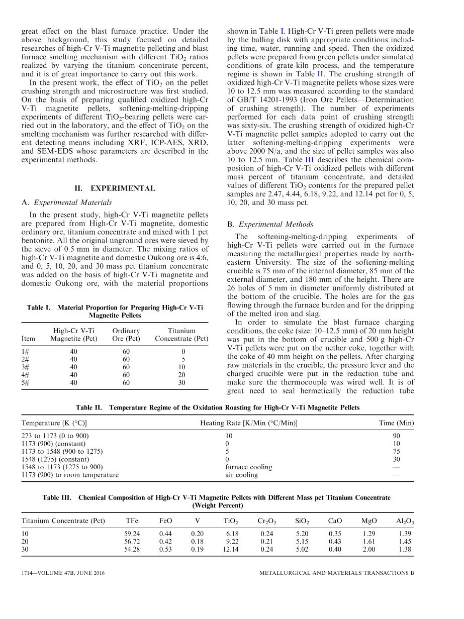 在本研究中,高铬钒钛磁铁矿球团需要从高铬钒钛磁铁矿制备,将国内普通矿石,钛精矿,混合1pct膨润土而制成。所有原始的磨矿产品经过直径为0.5mm的筛子。高铬钒钛磁铁矿矿石和国内oukong矿石的混合比为4:6,在含有0,5,10,20,和30%的钛精矿的高铬钒钛磁铁矿的基础上添加了国内oukong矿石,在表一显示在高铬钒钛球团配料比例造球团与适当的条件包括时间、水、运行速度的影响。而氧化焙烧制备颗粒的模拟高炉工艺条件及温度如表二所示。抗压强度氧化高铬钒钛磁铁矿颗粒的大小10至12.5mm,根据标准测量GB/T14201-1993(在铁球团的测定的抗压强度)。实验次数为根据抗压强度每个数据点进行,总共66次。对氧化高铬抗压强度钒钛磁铁矿颗粒样品进行实验发现比后者软化熔滴实验高于2000N/A,和颗粒样品的大小相比也高出10至12.5mm。表三描述的是化学成分、钛精矿质量百分比不同的高铬钒钛氧化球团关于不同TiO2含量对制备球团的影响样品粒级为2.47,4.44,6.18,9.22,和12.14,含量为0,5,10,20,和30%。