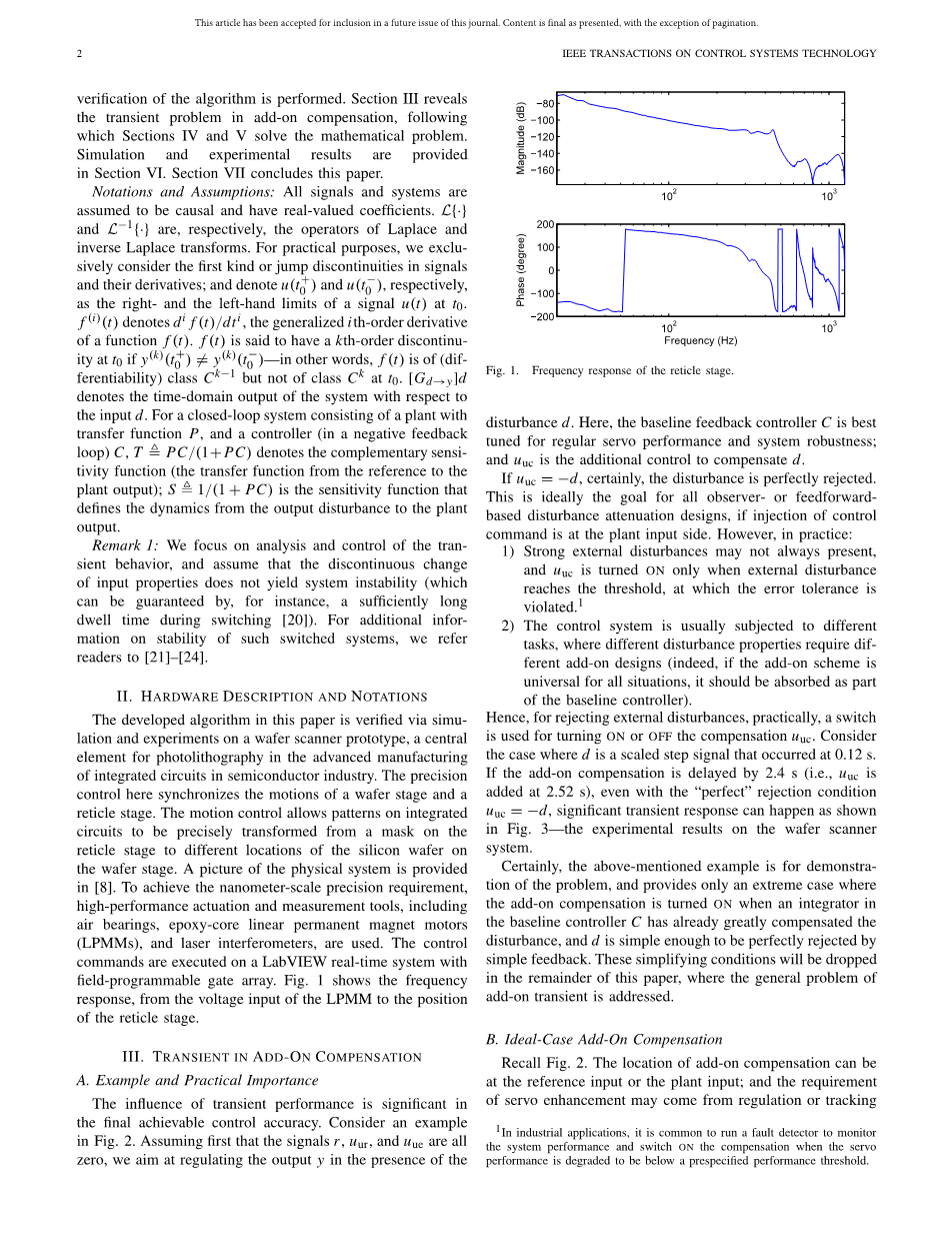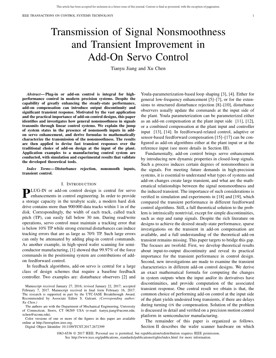从根本上说,附加控制带来伺服增强引入闭环信号的新的动态特性。这样一个过程产生的信号的非光滑性一定程度。为满足未来系统的高精度要求,了解它是什么类型的系统和附加的变化创造了大的瞬态必不可少的,什么是光滑和暂态信号之间的数学关系。这种考虑的重要性进行了验证,在模拟和实验[ 18 ]和[ 19 ],比较了在不同的前馈控制算法的瞬态性能。然而,一个完整的理论解决问题的本质上是平凡的,除了简单的不连续性,如步骤和斜坡信号。尽管丰富的文献设计,以达到所需的稳态性能,稀疏调查的瞬态补偿附加,并充分理解的理论附加瞬态仍然下落不明。本文旨在弥合这一差距,重点是双重的。首先,我们开发的理论结果,输入和输出的不连续性,并揭示其实际意义,在控制设计中的瞬态性能。第二,新的调查,检查在不同的附加控制设计的瞬态特性。我们推导出一个确切的数学公式计算系统输出的变化时,输入和/或其衍生物具有不连续性,并提供相关的瞬态响应的计算。一个中心的结果,我们得到的是,共同的选择进行附加控制的输入侧的植物产生不希望的长的瞬变,如果有在转向补偿延迟。该问题的解决方案进行了详细讨论,并验证了精密运动控制平台,在半导体制造。