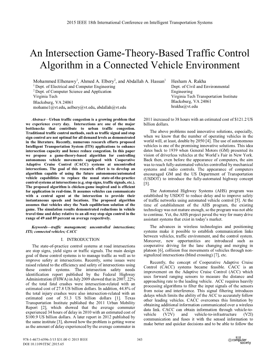 道路交叉口的实践控制系统是停止标志,产出标志或交通信号。这些控制系统的主要设计目标是管理交通以及提高交叉路口的安全。最近,提出了一些与使用这些控制系统的交叉口的效率和安全性有关的问题。联邦公路管理局(FHW A)2009年7月发布的交叉点安全需求识别报告显示,2007年,22%的致命碰撞事故是交叉相关的,估计费用为27.8美元。此外,总伤害事故中44.8%也与交叉相关,估计成本为51.3亿美元[1]。德克萨斯交通学院发布了2011年城市交通报告[2],其中显示,平均通勤者在2010年经历了34小时的延误,估计成本为100.9美元亿美元。 2012年由同一研究所[3]发表的一份后来的报告显示,由于2011年平均通勤者的延误量增加到38小时,估计费用为121.2亿美元,问题是如何恶化。