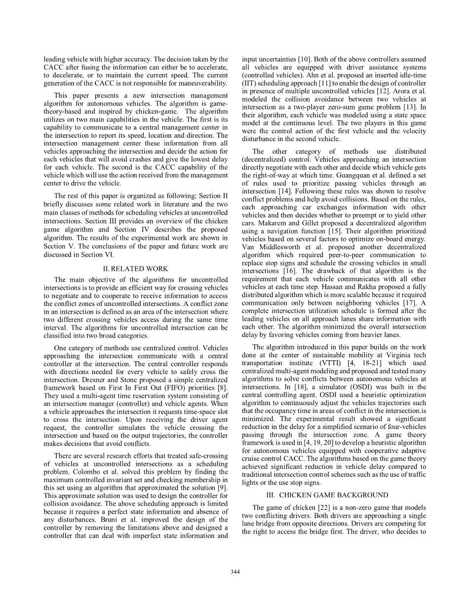 本文的其余部分组织如下:第二部分简要讨论了文献中的一些相关工作以及在不受控交叉点调度车辆的两种主要方法类型。第三节提供了鸡游戏算法的概述,第四节描述了所提出的算法。实验工作的结果见第五节。论文的结论和未来工作在第六节讨论。