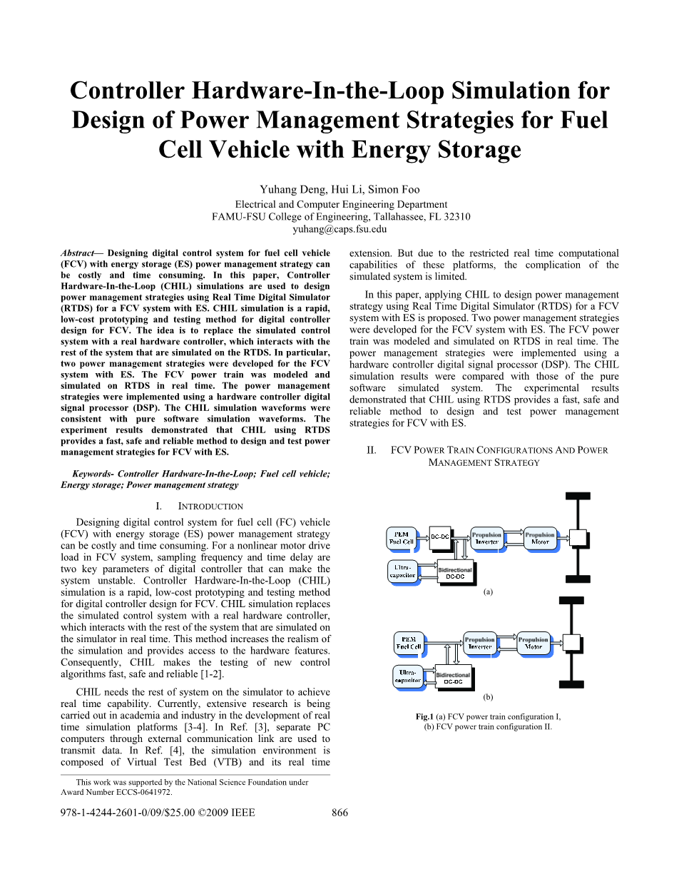 设计具有能量存储(ES)电力管理策略的燃料电池(FC)车辆(FCV)的数字控制系统可能是昂贵且耗时的。对于FCV系统中的非线性电机驱动负载,采样频率和时间延迟是数字控制器的两个关键参数,可以使系统不稳定。控制器硬件在环(CHIL)模拟是用于FCV的数字控制器设计的快速,低成本的原型和测试方法。CHIL仿真用实际硬件控制器替代了仿真控制系统,该控制器与模拟器上仿真的其余系统进行实时交互。这种方法增加了仿真的真实性,并提供了对硬件特性的访问。因此,CHIL使新的控制算法的测试快速,安全可靠[1] [2]。CHIL需要系统的其余部分在模拟器上实现实时性。目前,在实践模拟平台开发中正在学术界和行业进行广泛的研究[3] [4]。参考文献。[3],通过外部通信链路分离的PC电脑用于传输数据。参考文献。[4],仿真环境由虚拟测试台(VTB)及其实时扩展组成。但是由于这些平台的实时计算能力受限,仿真系统的复杂性受到限制。在本文中,提出了使用CHIL设计使用实时数字模拟器(RTDS)对具有ES的FCV系统的电源管理策略。针对具有ES的FCV系统开发了两种电源管理策略。FCV动力传动系实时模拟和模拟RTDS。使用硬件控制器数字信号处理器(DSP)实现电源管理策略。将CHIL仿真结果与纯软件仿真系统进行比较。实验结果表明,使用RTDS的CHIL提供了一种快速,安全可靠的方法来设计和测试具有ES的FCV的电源管理策略。