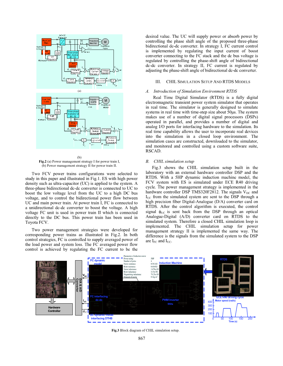 图3显示了使用外部硬件控制器DSP和RTDS实验室内置的CHIL仿真设置。采用5HP动态感应电动机模型,在ECE R40驱动循环下模拟具有ES的FCV系统。电源管理策略在硬件控制器DSP TMS320F2812中实现。信号VD C 和 一世U C从模拟系统通过RTDS上的高精度光纤数字模拟(D / A)转换卡发送到DSP。执行控制算法后,控制信号phi;U C通过RTDS上的光模拟数字(A / D)转换卡从DSP发回到仿真系统。因此,实现了封闭的CHIL仿真循环。电源管理策略II的CHIL仿真设置以相同的方式实现。区别在于从仿真系统到DSP的信号一世F C 和 一世U C。