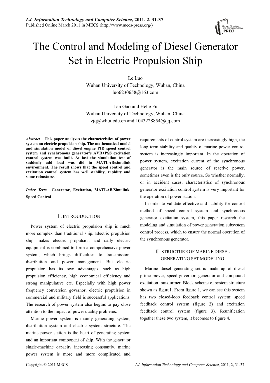 关键词:发电机,励磁,MATLAB / Simulink,速度控制