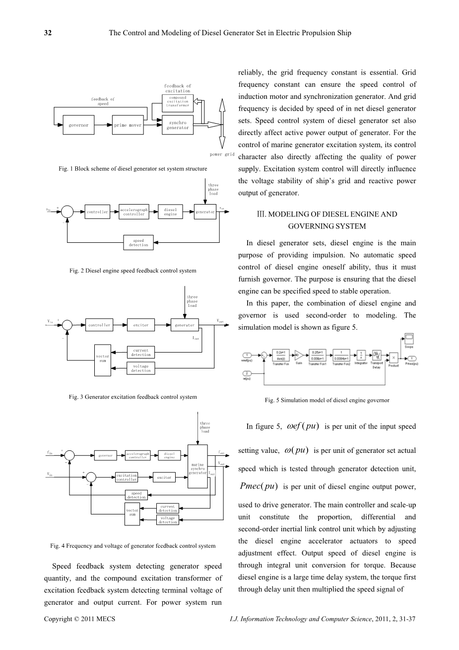 船用柴油发电机组由柴油原动机,调速器,发电机和复合励磁变压器组成。 系统结构框图如图1所示。从图1可以看出,该系统有两个闭环反馈控制系统:速度反馈控制系统(图2)和励磁反馈控制系统(图3)。将这两个系统组合在一起,就变成了图4。