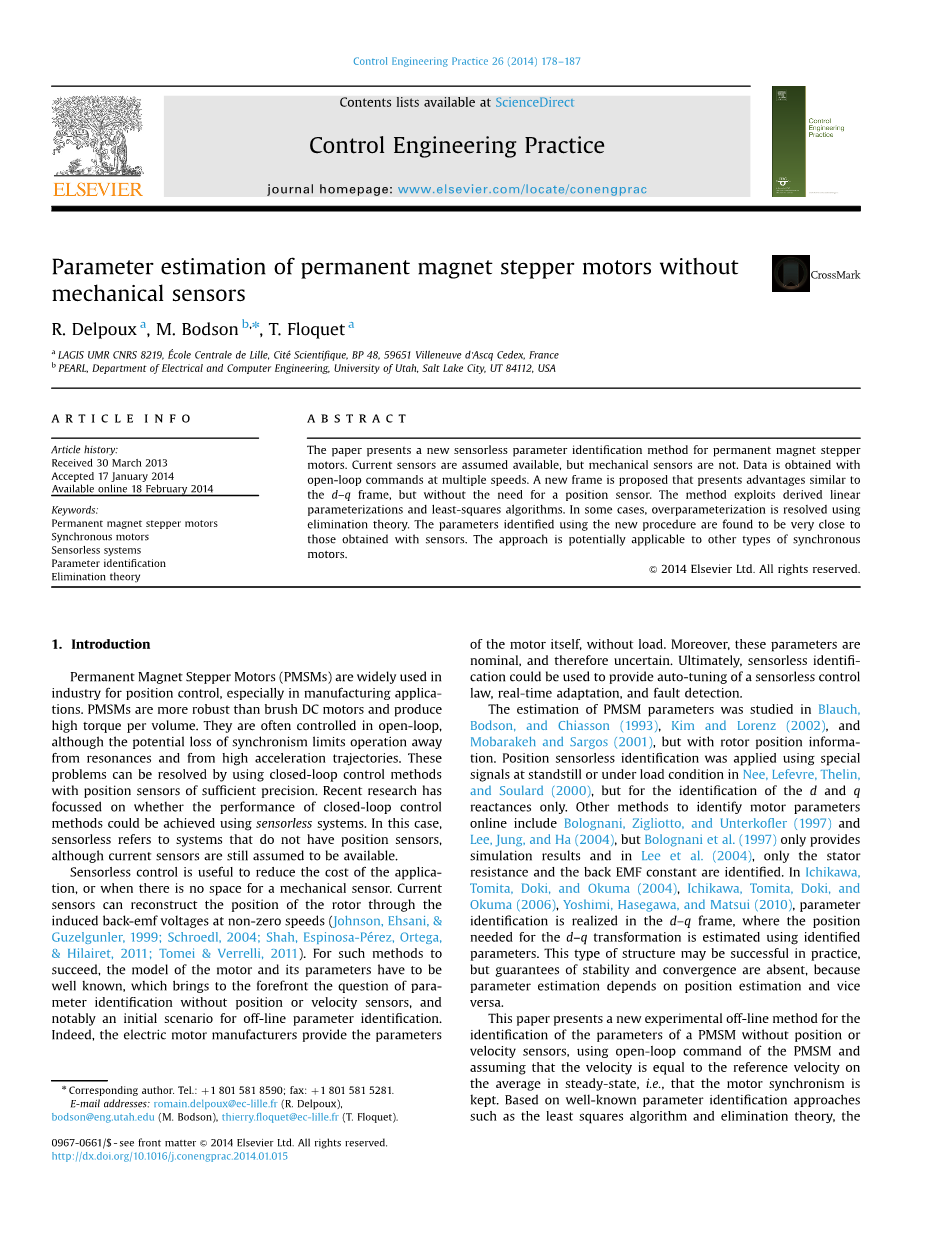 无传感器控制有助于降低应用成本,也有利于应对没有多余的空间安放机械位置传感器的问题。 电流传感器可以通过感应的反电动势电压在非零速度下重建转子的位置(Johnson,Ehsani,&Guzelgunler,1999; Schroedl,2004; Shah,Espinosa-Peacute;rez,Ortega,&Hilairet, Verrelli,2011)。 为了使这种方法成功运用,电机的模型及其参数的值必须是给定或可知的,这带来了难解决的在没有位置或速度传感器情况下的参数识别问题,特别是离线参数识别的最初情况设定的问题。