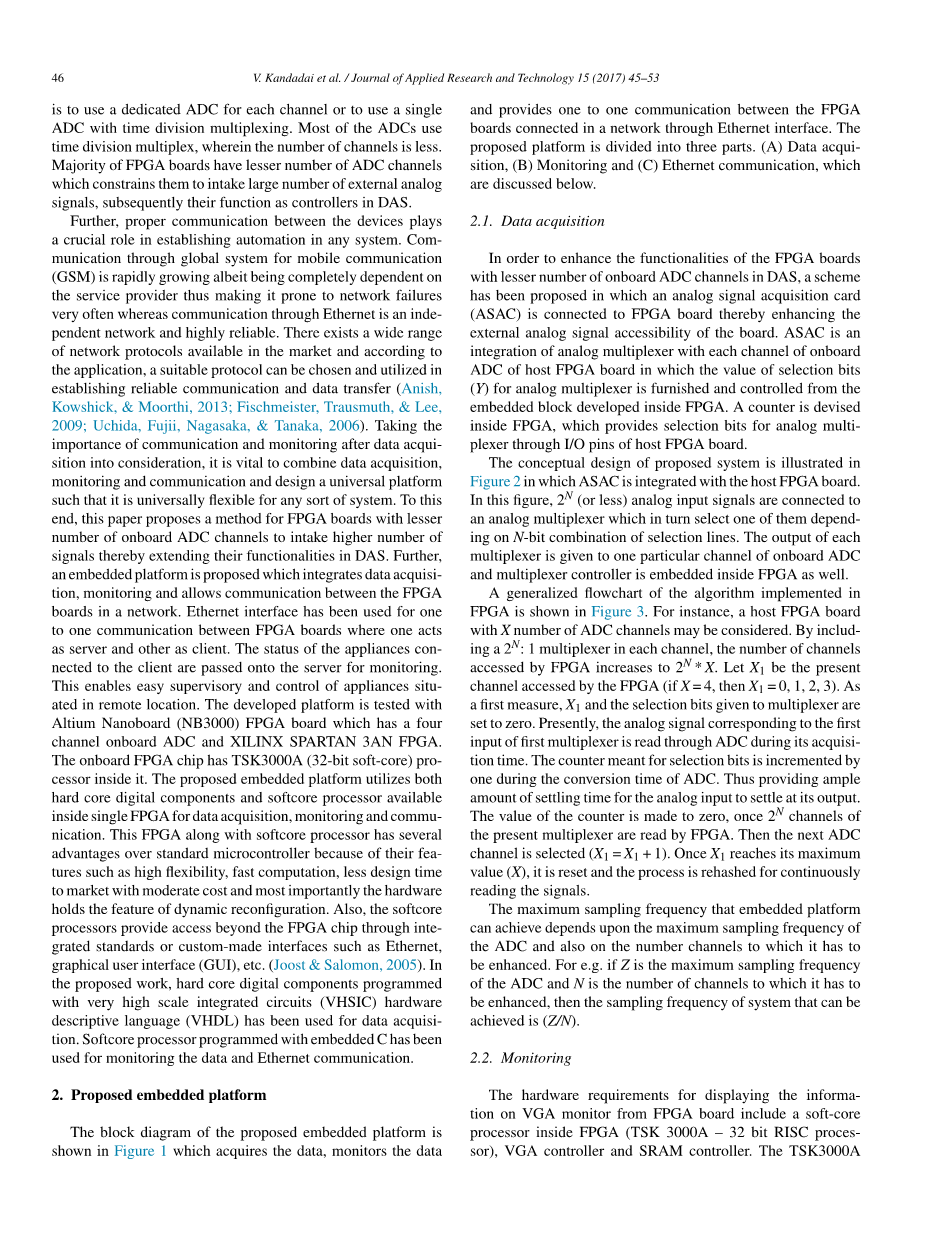 此外,设备之间的通信在建立任何自动化的系统中都起着至关重要的作用。通过全球移动通信系统(GSM)进行的通信正在快速增长,由于完全依赖于服务提供商,因此很容易发生网络故障,而通过以太网的通信是一个独立的网络,并且具有高度的可靠性。市场上存在各种各样的网络协议,根据应用不同可以选择合适的协议并用来建立可靠的通信和数据传输。考虑到数据采集后通信和监测的重要性,将数据采集、监测和通信结合起来并设计一个通用平台对于任何类型的系统都具有普遍的灵活性,这显得至关重要。为此,本文提出了一种用具有较少数量ADC通道的FPGA板的方法,以接收更多数量的信号,从而扩展其在DAS中的功能。此外,还提出了一个嵌入式平台,它集成了数据采集、监控以及允许网络中FPGA板之间的通信。以太网接口已被用于FPGA板之间的一对一通信,其中一块用作服务器,另一块用作客户端,连接到客户端的设备的状态被传递到服务器上进行监视。使得可以轻松监控处于远程位置的电器。开发的平台通过Altium Nanoboard(NB3000)FPGA板进行测试,板上有四通道ADC和XILINX SPARTAN 3AN FPGA。板载FPGA芯片内部具有TSK3000A(32位软核)处理器。提出的嵌入式平台利用单个FPGA内部的硬核数字组件和软核处理器进行数据采集、监控和通信。这款FPGA和软核处理器比标准微控制器具有多项优势,例如它们灵活性高、计算速度快、上市时间短,成本适中等,最重要的是硬件具有动态重新配置功能。此外,软核处理器通过集成标准或定制接口(如以太网,图形用户界面(GUI)等)提供FPGA芯片以外的访问权限。在所提出的工作中,用超大规模集成电路(VHSIC)硬件描述语言(VHDL)编程的硬核数字组件已被用于数据采集,使用嵌入式C编程的Softcore处理器已用于监视数据和以太网通信。