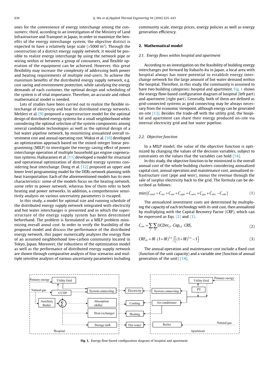 根据日本板桥区提出的建设能源交换的可行性研究,与医院的地方一起,总是有更多的潜力建立医院内大量热水需求的能量交换网络。 因此,在这项研究中,社区被假定有两个建筑类别:医院和公寓。 图1显示了医院(左侧)和公寓(右侧部分)的基于能量流的配置图。 一般来说,它们都被定义为并网系统,因为网格连接可能总是需要从经济观点,异构抗体在现场发生[13]。 除了与公用电网的权衡外,医院和公寓还可以通过内部电网和热水管道分享现场生产的能源。