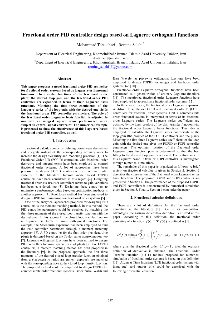 基于拉盖尔正交函数的分数阶PID控制器设计外文翻译资料