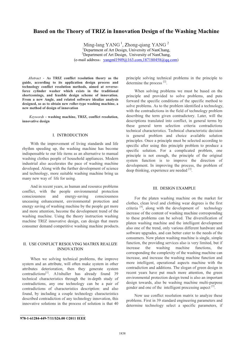 关键词:洗衣机,TRIZ,冲突解决方案的创新设计。