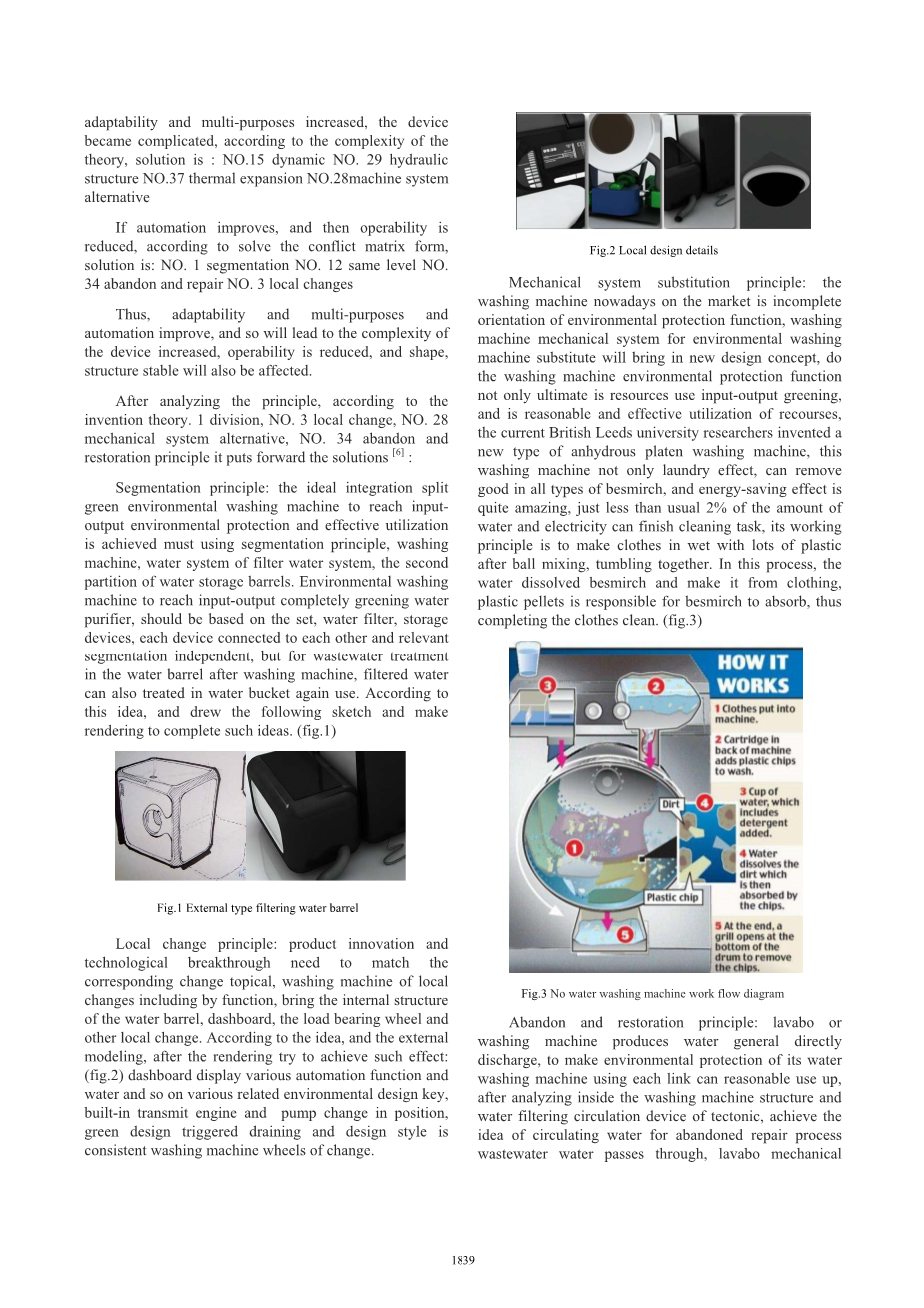 机械系统替代原理:时下市场上洗衣机的环保功能定位不全面,洗衣机机械系统对于环保洗衣机替代品将带来全新的设计理念,做洗衣机的环保功能不但最终是资源利用输入投入绿化,并且是合理有效地利用资源,目前英国利兹大学研究人员发明了一种新型的无水滚筒洗衣机,这种洗衣机不仅具有洗衣效果,还可以去除各类污渍,并且节能效果相当惊人,比平时少用2%的水电量就可以完成清洗任务,其工作原理是在球混合后将衣物放入潮湿的大量塑料中,一起翻滚。在这个过程中,水溶解了污渍并使其脱离衣服,塑料颗粒负责污渍吸收,从而完成衣物清洁。 如(图3)。