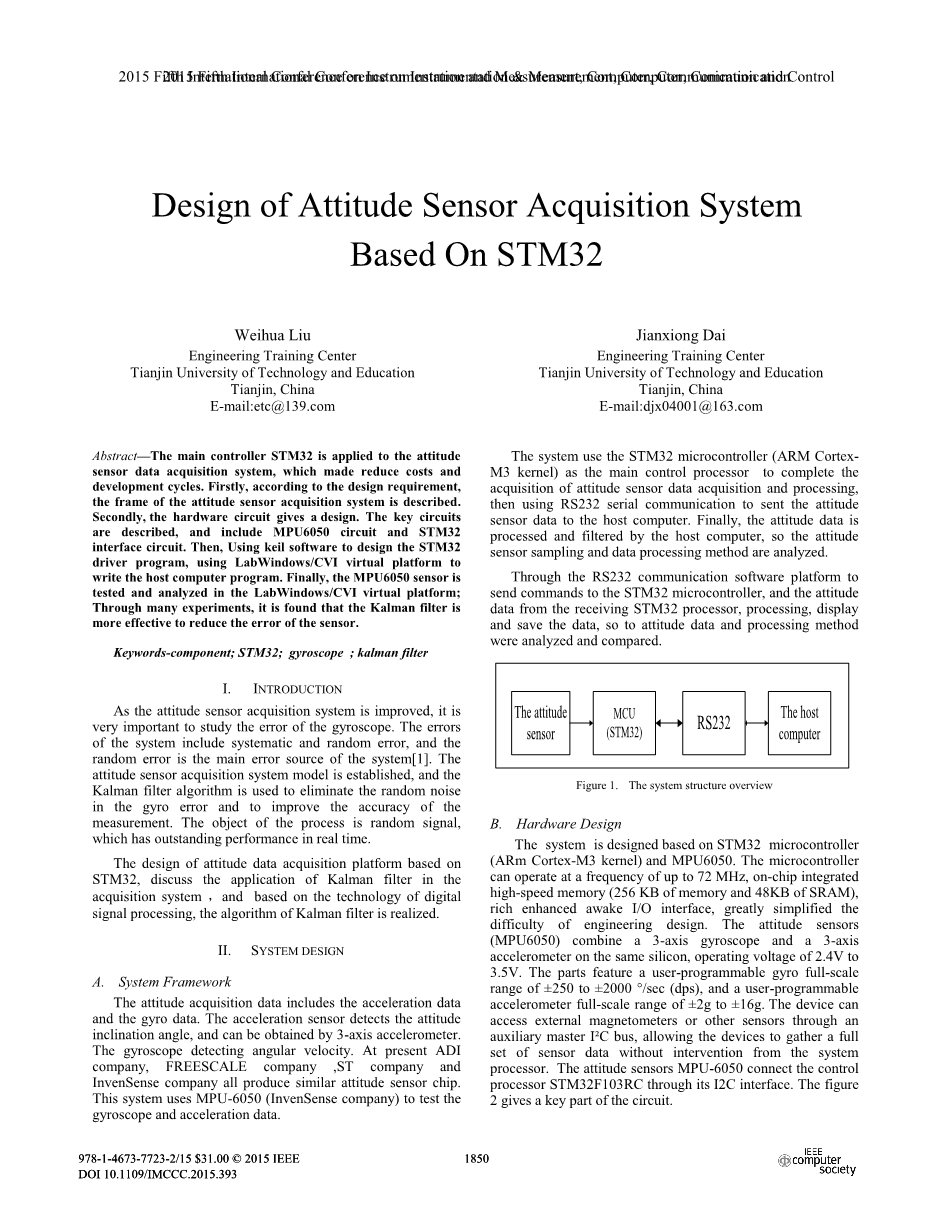 姿态采集数据包括加速度数据和陀螺仪数据。加速度传感器检测姿态倾角, 可通过3轴加速度计获得。陀螺仪检测角速度。目前 ADI 公司、FREESCALE 公司、ST 公司和英文森公司均生产类似的姿态传感器芯片。该系统使用 MPU-6050 (吸入感知公司) 来测试陀螺仪和加速度数据。该系统采用 STM32 微控制器 (ARM Cortex-m3 内核) 作为主控制处理器, 完成姿态传感器数据采集和处理, 然后利用 RS232 串行通信将姿态传感器数据发送到主机计算机。最后, 由主机对姿态数据进行处理和过滤, 分析了姿态传感器采样和数据处理方法。通过 RS232 通信软件平台向 STM32 微控制器发送命令, 并对其姿态数据进行分析。