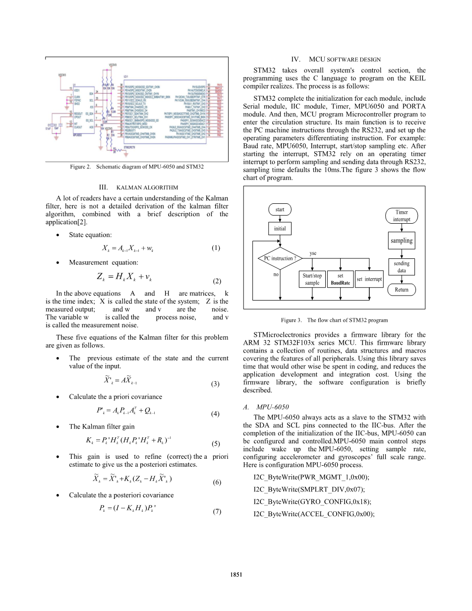 该系统是基于 STM32 微控制器 (ARm Cortex-m3 内核) 和 MPU6050 设计的。微控制器可在高达 72 MHz 的频率下工作, 片上集成高速内存 (256 KB 内存和48KB 的 SRAM), 丰富的增强的清醒ito接口, 大大简化了工程设计的难度。姿态传感器 (MPU6050) 将3轴陀螺仪和3轴加速度计结合在同一芯片上, 工作电压为 2.4 v 至 3.5 v。这些部件具有用户可编程陀螺全范围范围plusmn;250至plusmn;2000°sec (dps), 以及用户可编程加速度计全尺寸范围为plusmn;2g 至plusmn;16 g。该设备可以通过辅助主 isup2;c 总线访问外部磁强计或其他传感器, 使设备能够收集完整的传感器数据集, 而无需系统处理器的干预。姿态传感器 MPU-6050 通过 I2C 接口连接控制处理器 STM32F103RC。图2给出了电路的关键部分。
