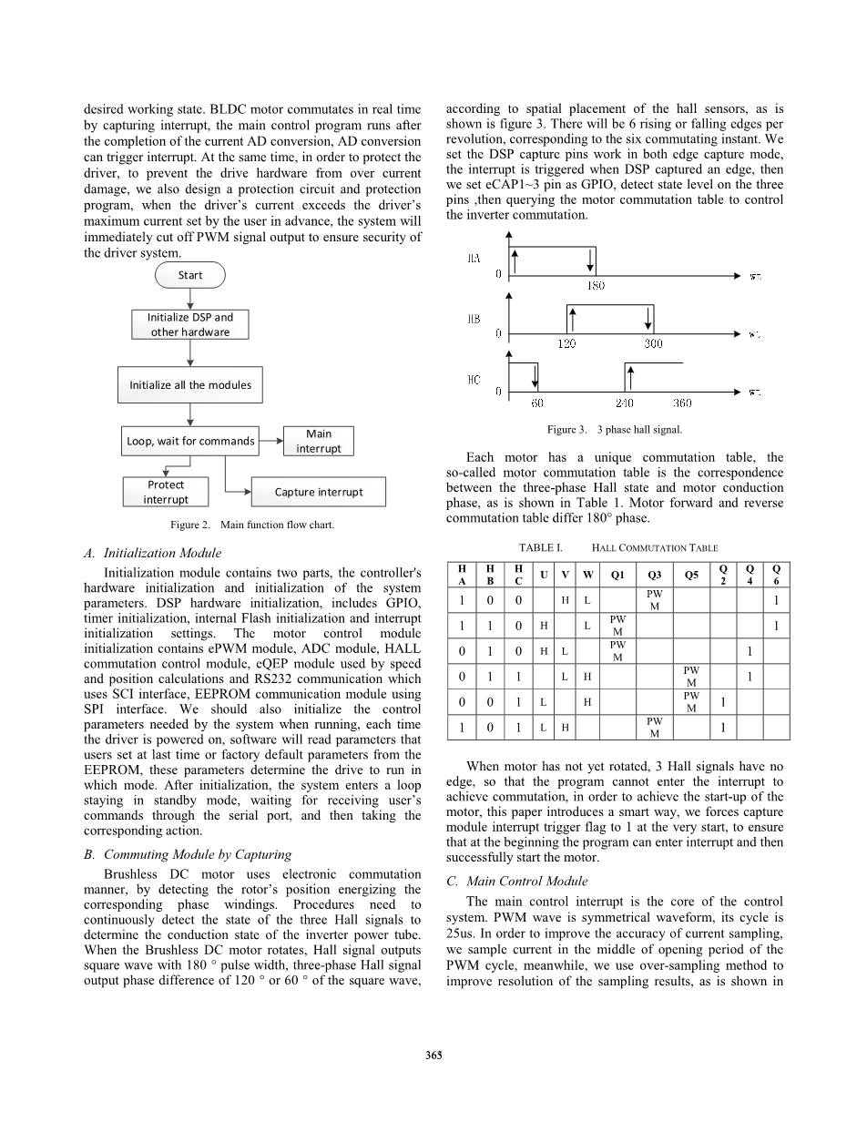 初始化模块包括控制器硬件初始化和系统参数初始化两部分。DSP硬件初始化,包括GPIO、定时器初始化、内部闪存初始化和中断初始化设置。电机控制模块初始化包括ePWM模块、ADC模块、霍尔换相控制模块、用于速度和位置计算的eQEP模块、使用SCI接口的RS232通信模块和使用SPI接口的EEPROM通信模块。我们还要在运行时初始化系统的控制参数,每次驱动上电时,软件都会从EEPROM中读取用户上次设置的参数或出厂默认参数,这些参数决定了运行模式。初始化后,系统进入一个保持待机状态的循环,等待接收用户通过串口发出的命令,然后采取相应的动作。