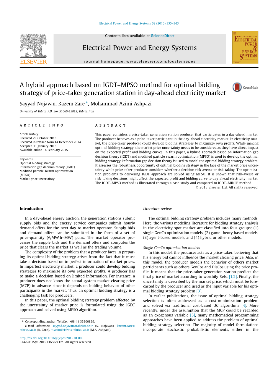 受价发电站的基于IGT–MPSO的最优竞价混合方法在日前电力市场中的应用