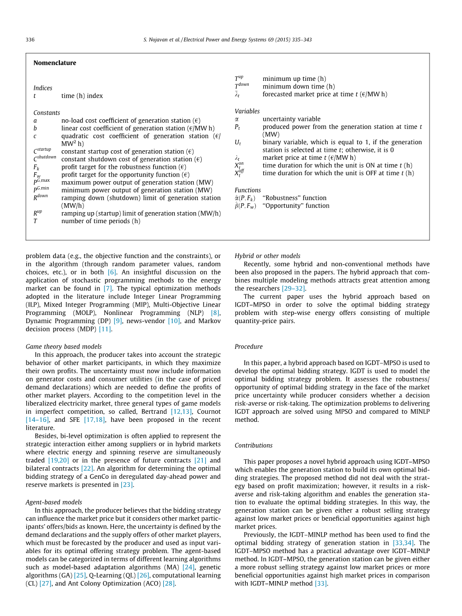 在本文的其余部分安排如下。 “IGDT-MPSO背景”一节提供了IGDT和MPSO的背景知识。 “问题制定”部分致力于分析不确定性问题并引入IGDT技术以实现最优投标策略问题。 “解决方案方法”一节强调了价格接收者生成站的解决方案。 对于测试结果,通过案例研究说明IGDT-MPSO方法,并与“案例研究”部分中的IGDT-MINLP方法进行比较。 “结论”部分总结了论文。