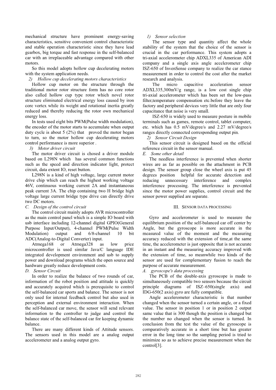 为了实现两轮赛车的平衡,机器人的位置和姿态的信息快速,准确地获取这是前提,以控制自平衡汽车运动和平衡。该传感器不仅用于内部反馈控制,也可以用于感知与外部环境的相互作用。当自平衡车移动时,传感器将相关信息发送到控制器去判断和控制的自平衡赛车的平衡状态以保持动态平衡。