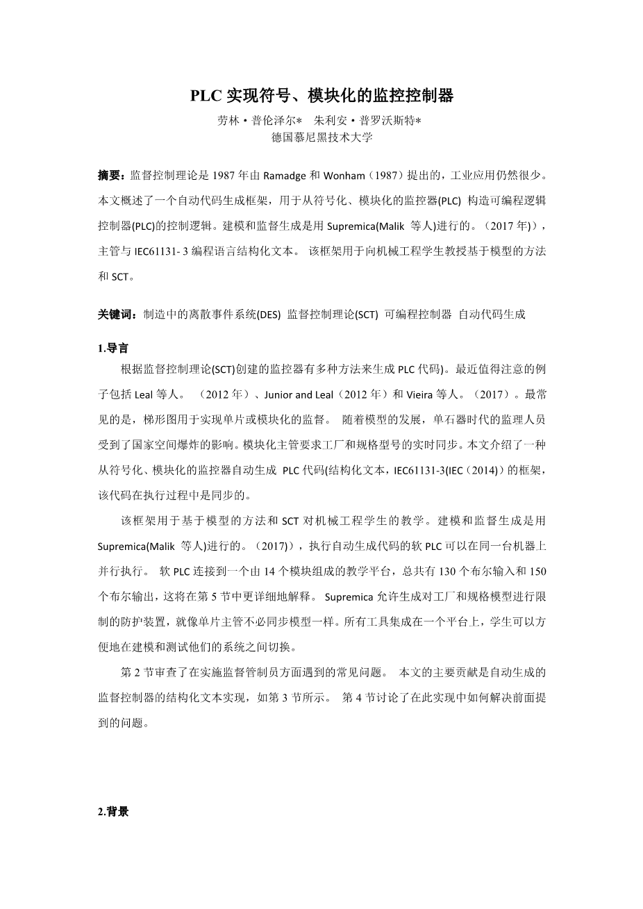 PLC实现符号、模块化的监控控制器外文翻译资料 2023-08-17 14:54:04 英语原文共 6 页,剩余内容已隐藏,支付完成后下载完整资料 英语译文共 11 页,剩余内容已隐藏,支付完成后下载完整资料 资料编号:[606160],资料为PDF文档或Word文档,PDF文档可免费转换为Word 您需要先支付 30元 才能查看全部内容!立即支付 发小红书推广免费获取该资料资格。点击链接进入获取推广文案即可: Ai一键组稿 | 降AI率 | 降重复率 | 论文一键排版 PREVIOUS NEXT 您可能感兴趣的文章 基于Matlab的无刷双馈电机建模与仿真文献综述 基于51单片机的温控风扇设计文献综述 调光参数集中控制的智慧型室内LED照明系统设计开题报告 小区车辆防逆行警告系统设计开题报告 基于Matlab/Simulink变桨距控制系统的仿真研究开题报告 电力系统暂态稳定的MATLAB/Simulink仿真开题报告 同步磁阻电机设计与性能分析文献综述 基于Matlab/Simulink的永磁同步电机控制系统仿真开题报告 基于SVM的图像无参考质量评价算法的研究开题报告 自动浇花系统的开发与设计开题报告