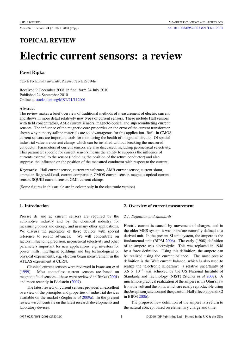 Iwansson等人在1999年就已经对经典电流传感器进行过综述。Ripka和Edelstein也分别与2001年和2007年指出大多数非接触式电流传感器都是电磁式传感器。