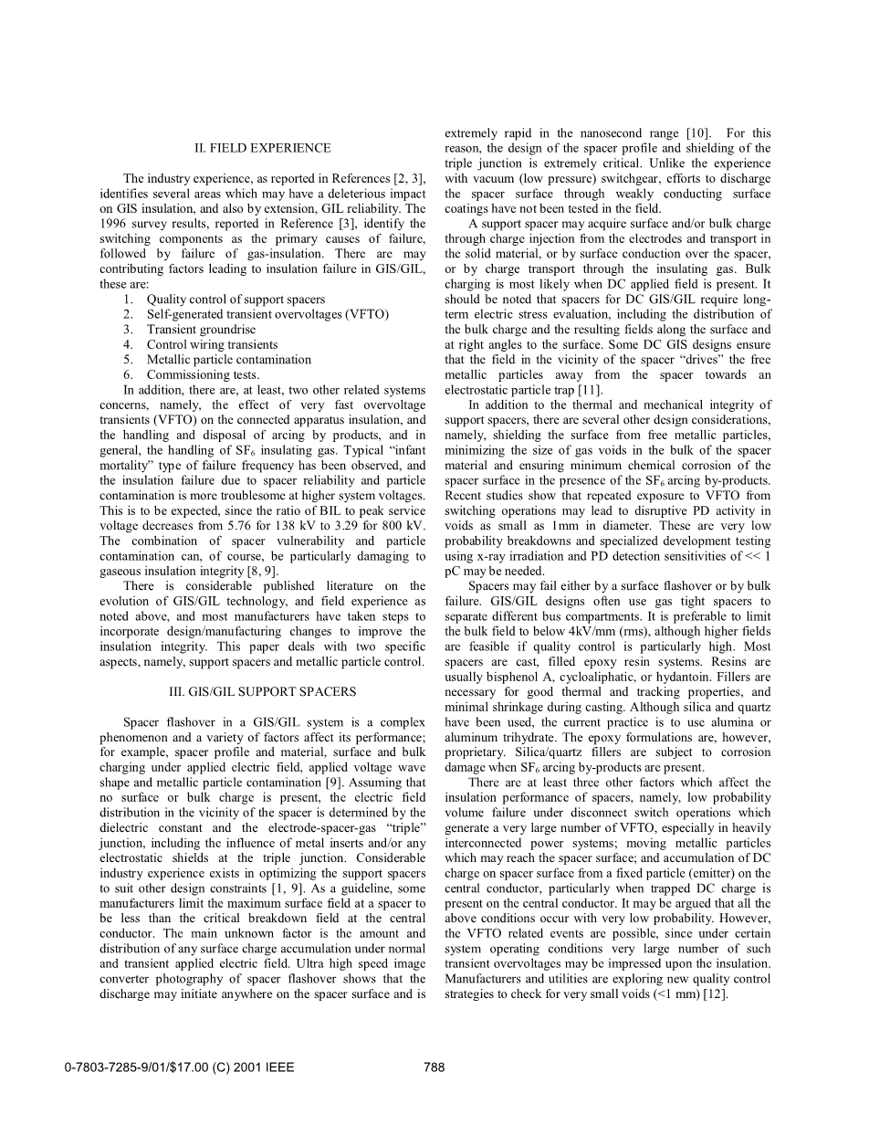 此外,至少还有两个其它相关系统问题,一是陡坡前过电压(VFTO)对连接的绝缘装置上的影响,二是对SF6绝缘气体的电弧放电的处理。典型的“早期故障期”的故障频率已经被观察发现,而且因为盆式绝缘子可靠性和颗粒污染导致的绝缘故障在更高的系统电压下更难以解决。然而这是可以预估的,由于BIL与峰值服务电压的比率从138kV的5.76降低到800kV的3.29,盆式绝缘子脆弱性和颗粒污染的组合会更严重的损害气体绝缘的完整性[8,9]。