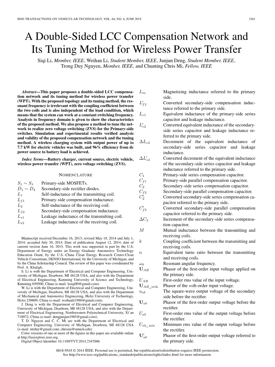 关键词:电池充电,电流源,电动汽车,无线电力传输(WPT),零电压开关(ZVS)。