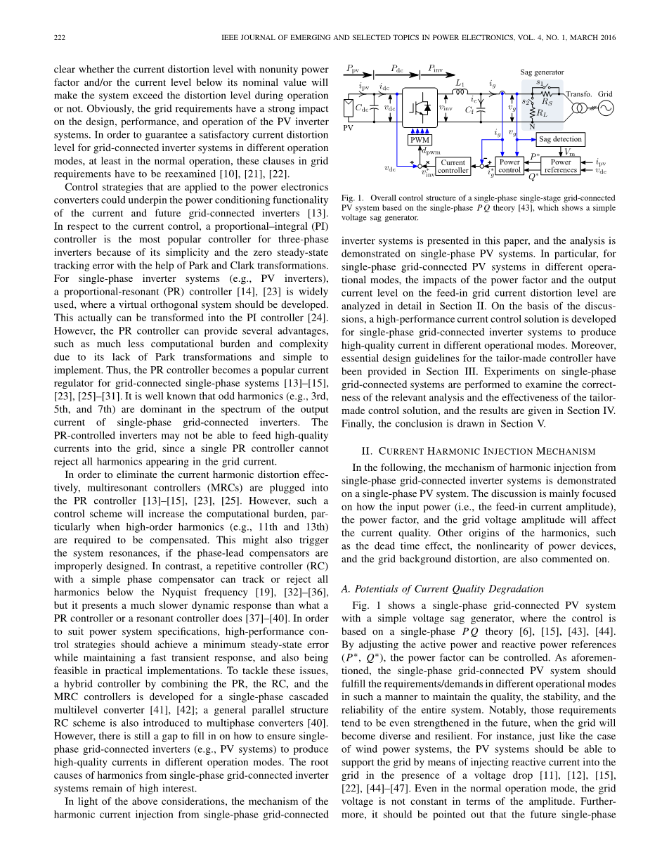 图1是一个带简单电压跌落发生器的单相并网光伏逆变器,它是基于PQ理论控制的[6,15,43,44]。功率因数可以通过调节有功功率和无功功率(P*,Q*)来控制。如前文所述,单相并网光伏系统在不同运行条件下都应满足质量、稳定性和可靠性要求。值得注意的是,将来电网变得多样化和弹性时,这些要求往往会加强。;例如,光伏发电系统应该能够像风力发电系统一样,在电网电压下降时向电网注入无功功率。即使在正常工作模式下,电网电压的幅值也不是恒定不变的。此外,应该指出的是,未来的单相光伏发电系统也可能需要提供辅助服务[21,48-52]。在这种情况下,功率因数不统一,即使光伏系统是在MPPT模式下操作的。事实上,由于光伏逆变器通常在设计时留有余地,使得光伏逆变器能够注入MPPT控制的无功功率。总之,反馈的异常操作可以影响电流的质量,例如,夜间的低电压运行和无功功率[48,49],和光伏逆变器的电能质量可能会随着操作模式变化。