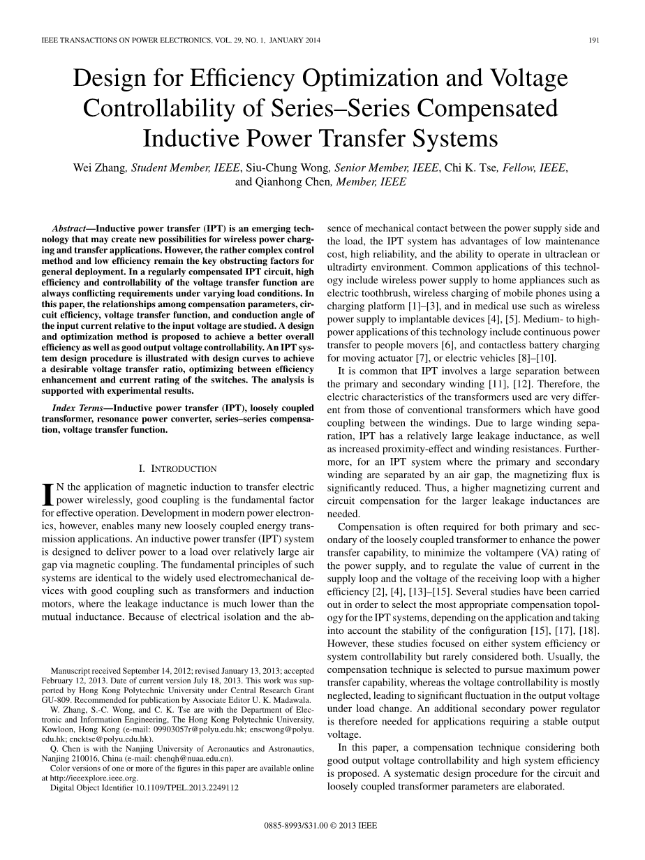 摘要 感应电能传输(IPT)是一种新兴的技术,可为无线能量传输和充电带来新的可能。然而,较为复杂的控制方法和较低的效率仍然是阻碍这项技术发展的障碍。在常见的含有补偿网络的感应电能传输电路中,在负载变动的情况下,实现高的效率和电压传递函数的可控性一直是互相矛盾的要求。本文研究了补偿网络参数、电路效率、电压传递函数和输入电压导通角与输入电压之间的关系。提出了一种可以获得较高的总体效率和较好的输出电压可控性的设计和优化方法。展示了一个感应电能传输系统的设计流程,并提供了设计曲线,以用于获得一个所需的电压传输比,和在提高效率和开关器件的电流应力之间进行优化。分析过程由实验结果提供支撑。