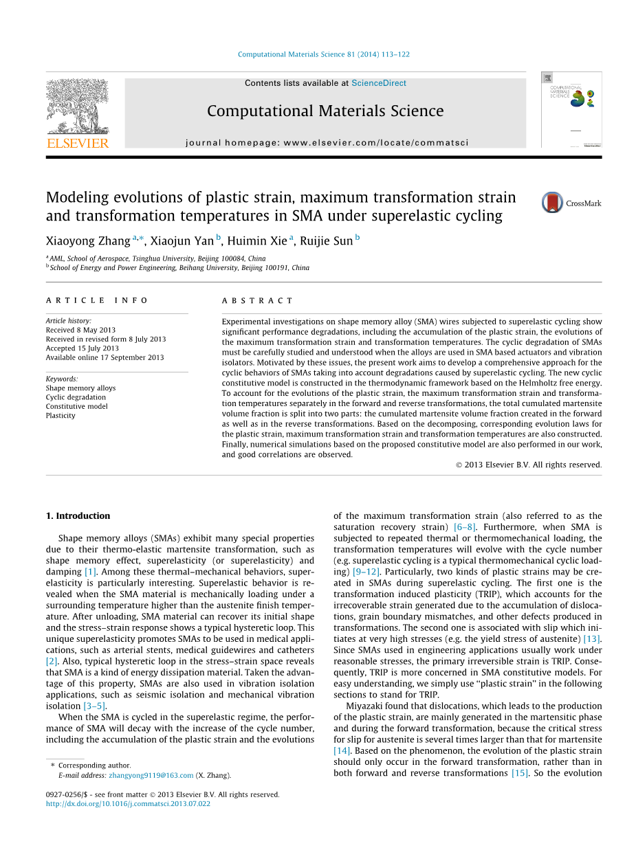 然而,现在的描述SMA的超弹性循环效应的本构模型通常假设了一个与塑性应变的正向和反向变换相关的演变规律。此外,塑性应变,最大变形应变和转变温度的演变在现有模型中几乎不被同时考虑[16-22]。