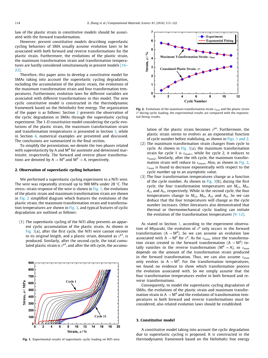 基于第2节中的陈述,假设在循环期间在正向变换中以指数单调地演变。 因此,可以假定为:(8) 其中表示达到饱和值时的最大变化量,是循环前的初始值,可以通过超弹性循环实验获得。 形状因子可以从实验测试获得。