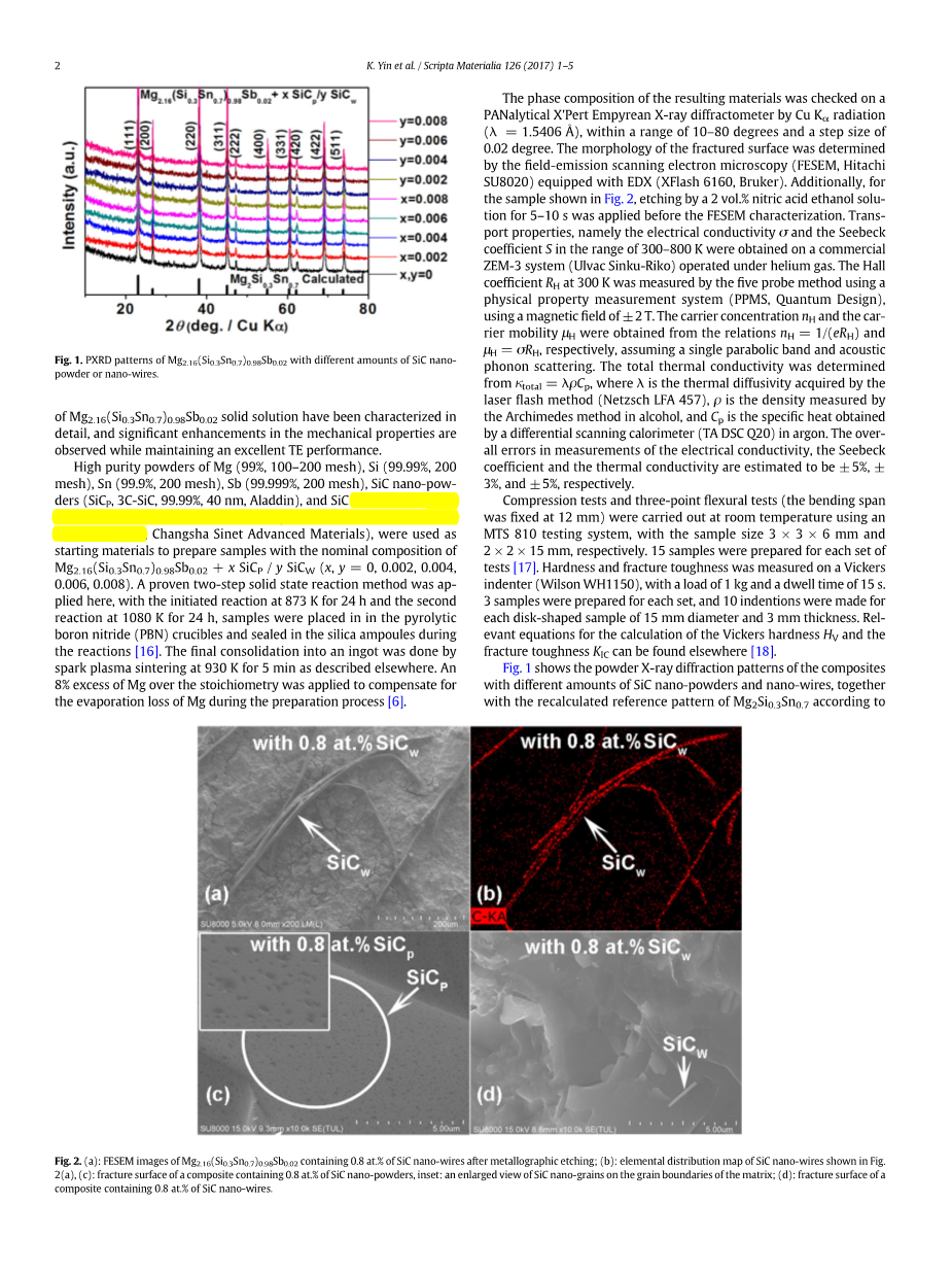已经有研究表明,掺加具有高强度和高弹性模量的添加剂是改善复合材料的韧性的好方法[11-13]。在我们的这项工作中,我们利用SiC纳米粉末和纳米线(SiC纳米线是一种径向上尺寸低于100nm,长度方向上远高于径向尺寸的单晶纤维),试图改善 固溶体的力学性能,并且发现材料并没有任何显著的热电性能退化的现象。所以SiC的选择的正确性是显而易见的。SiC具有优异的机械性能(弯曲强度为640MPa,在室温下的断裂韧性为3.8 ),同时它的热膨胀系数很低(室温下仅为 ),并且材料的密度很低(3.21 )以及具有良好的热稳定性(在3103 K下熔化)[14,15]。SiC的相分数不同和形态不同(即纳米粉末对纳米线)对 固溶体的热电性能和力学性能的影响先前已经被详细介绍过了,并且我们发现复合材料保持了优异的热电性能的同时可以观察到复合材料力学性能的显著增强。