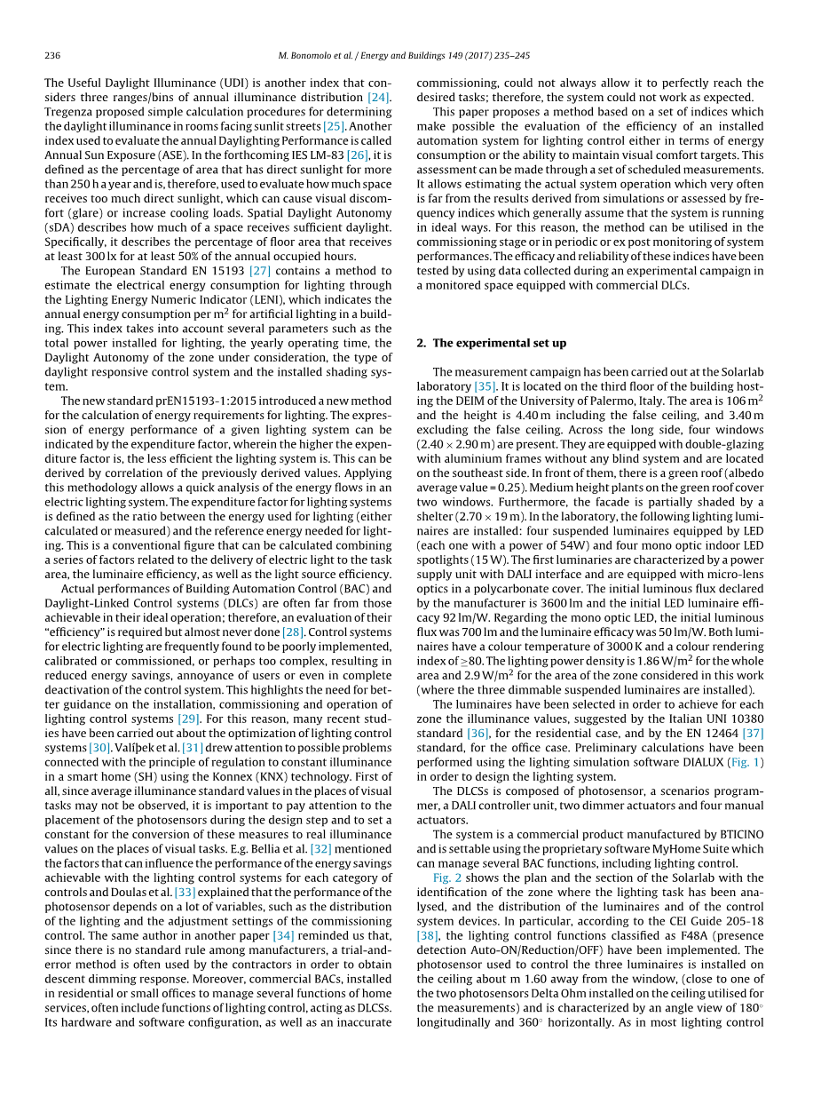 只有通过处理给定空间中可用的自然和人工照明数据(测量或模拟),才能对给定系统的照明和能源性能进行评估。在使用能够分别计算这两个项目的模拟软件的情况下,这个问题变得微不足道,而在实践中,一旦打开或调暗人工光源,光电传感器就不再能够分割这两个贡献。事实上,当自然光随时间变化,系统减少或增强其光通量时,就不可能再准确地估计它了。此外,只有一个“理想”系统能够保证一个恒定的照度设定点;因此,人工光的绝对和相对贡献是可变的。为了分割自然照明和人工照明对室内照度的贡献,在实验工作中研究了两种方法。第一种方法是基于光通量与吸收功率之间的比例,这是相当可靠的。由于自然光和人工照明的贡献之和,有必要测量吸收功率和照度值。通过应用W/lx因子(在夜间测量),可以轻松计算出仅人工照明的贡献,因此,发现测量到的总照度和计算出的人工照明之间的自然照明贡献是不同的。在工作的第一步中,该方法已用于测试连续运行计划中的指标。