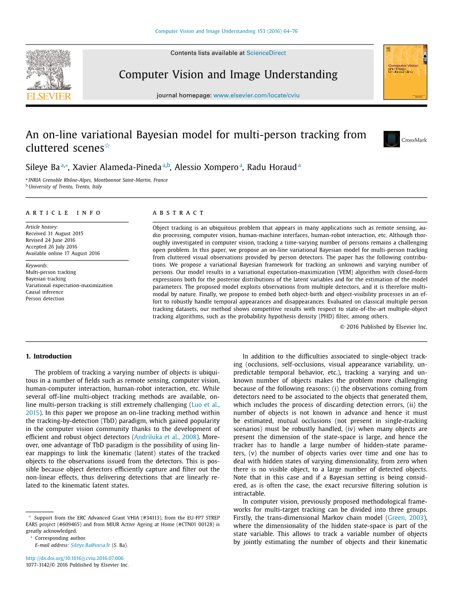 目标跟踪是一个普遍存在的问题,出现在遥感、音频处理、计算机视觉、人机界面、人机交互等诸多应用中。尽管在计算机视觉中进行了彻底的研究,跟踪时变数量的人仍然是一个具有挑战性的开放问题。在本文中,我们提出了一种在线变分贝叶斯模型从人体探测器提供的杂乱的视觉观察中进行跟踪。本文有以下贡献。我们提出了一个变分贝叶斯框架来跟踪一个未知的和变化的人数。我们的模型产生了一种变分期望最大化(VEM)算法,该算法具有闭合形式表达式,用于潜在变量的后验分布和模型参数的估计。所提出的模型利用了来自多个探测器的观测结果,因此它本质上是多模态的。最后,我们建议同时嵌入对象诞生和对象v可见性过程,以稳健地处理时间外观和消失。在经典的多人跟踪数据集上进行评估,我们的方法显示了竞争的结果到最先进的多目标跟踪算法,如概率假设密度(PHD)滤波器等。