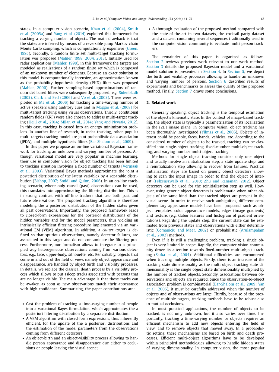 在一个计算机视觉场景中,Khan等人(2004),史密斯塔尔。(2005a)和Yang 等人(2014)利用该框架来跟踪不同数量的对象。其主要缺点是,这些状态是通过可逆跳跃马尔可夫链蒙特卡洛抽样来推断的计算成本很高(Green,1995)。其次,提出了一种随机有限集多目标跟踪公式(Mahler,1998,2004,2013)。最初用于雷达应用(马勒,1998),在这个框架中,目标被建模为一个被组成的随机有限集的实现的一个未知数量的元素。由于该模型的精确解是计算密集型的,因此提出了一种被称为概率假设密度(PHD)滤波器的近似方法(Mahler, 2000).随后进一步提出了基于采样的基于随机深度的滤波器近似,例如Sidenbladh(2003)、Clark和Bell(2006)和Vo等人(2003)。这些都是在马等人中利用的 Al.(2006)使用听觉线索跟踪时变数量的主动说话者,在Maggio等人(2008)中使用视觉观察进行多目标跟踪。第三,条件随机场 (CRF)也被选择来处理多目标跟踪(Heili等,2014;米兰等,2014;杨和Nevatia,2012)。在这种情况下,跟踪被归入为一个能量最小化问题。在一个 她的研究领域,在雷达跟踪方面,其他流行的多目标跟踪模型是联合概率数据关联(JPDA)和多重假设滤波器(Bar-Shalom,2009)。在这个 本文提出了一个在线变分贝叶斯框架来跟踪一个未知的和变化的数量的人。虽然变分模型在机器学习中非常流行,它们在计算机视觉中的应用一直受到限制跟踪涉及固定数量的目标(Vermaak., 2003)。变分贝叶斯方法近似于关节a潜在变量的可分离分布的后验分布(Bishop,2007;Smidl和Quinn,2006)。在在线跟踪场景中,只能使用因果关系(过去的)观察结果,这就转化为近似的滤波分布。这是与同时使用过去和未来的观察。因此,所提出的跟踪算法是对隐藏状态的后验分布进行建模所有过去的观察。重要的是,所提议的框架导致了领先到该模型的后验分布的封闭形式的表达式隐藏变量和模型参数,从而产生一个通过变分EM(VEM)算法实现的本质上有效的过滤过程。此外,还定义了一个杂波目标,使伪观测,即探测器故障与此目标相关联,并且不会污染过滤过程。此外,我们的形式允许以有原则的方式整合来自各种探测器的异质观测脸、上半身、轮廓等。值得注意的是,对象进出视野,即物体的外观和外观消失,由对象的诞生和可见性过程来处理。最后,我们用一个可见性过程取代了经典的死亡过程,该过程允许放置与那些人相关的睡眠轨迹不再可见。最主要的优点是,这些轨道可以做到一旦新的观察结果与它们的外观相匹配,它们就会被唤醒充满信心。综上所述,本论文的贡献如下: