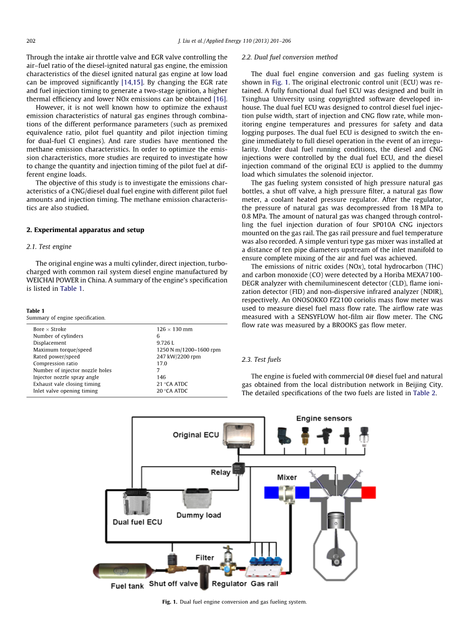 In order to address these problems, dual fuel combustion con-cept was utilized by many researchers. With port injection of a low-reactivity fuel combining direct in-cylinder injection of a high-reactivity fuel, the combustion phasing and duration can be flexibly controlled through reactivity gradient [4–7]. A higher oc-tane number (ON) indicates a higher resistance to auto-ignition, which in turn can effectively extend the upper load limit of the dual fuel engine without using too much EGR. From this point of view, natural gas with large proven reservesand high ON is the best choice of the port injection fuel.