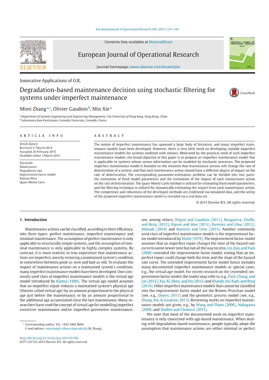 维护行动可以根据其效率分为三种类型:完美的维护,不完善的维护和最低的维护。完美维护的假设仅适用于结构简单的系统,而维护的假设仅适用于高度复杂的系统。相比之下,在真实体验中,维护行为是不完美的,只是将维护的系统的状态恢复到新旧与旧的之间。为了评估维护措施对维护系统状况的影响,已经开发出许多不完善的维护模型。—个常用的不完善的维护模型是由Kijima(1989)引入的虚拟时代模型。虚拟时代模型假设不完美的修复将维持系统的身体年限(其中所谓的虚拟时代)减少了与维护前的身体年限成比例的量,或者与自从维护以来累积的额外年限成正比的量。许多研究人员使用虚拟时代的概念来建模不完美的校正维护和/或缺陷预防性维护; 参见Doyen和Gaudoin(2011),Bouguerra,Chelbi,和Rezg(2012),Dijoux和Idee(2013),Ramirez和Utne(2013),Ahmadi(2014)和Ramirez和Utne(2075)。另—个常见的使用不完善的维护模式是改进的,由Malil(1979)引入的模型。改进因素模型假设不完美的修复改变了危险率的时间曲线到—些较新的时间,但不是—直到零。Lin,Zou,和Yam(2000)扩展了改进因子模型,完善的修复可以改变危险的时间和坡度速率曲线。因此,扩展改进因子模型包括许多文件不完善的维护模式作为特殊情况,例如虚拟时代模型。对于(扩展)改进因子模型的最近研究,读者可以参考例如,Parh,Chang和Lie(2012),Xia,Xi,Zhou和Du(207 2)和Khatab,Ait-Kadi和Rezg(2014)。 不能分类为改进因子模型的其他不完善的维护模型是Brown-Proschan模型(参见例如Doyen,2071)和几何过程模型(参见例如Zhang,Xie,&Gaudoin,2013)。 评估不完善维护模式的工作,例如由Wang和Pham(2006),Nakagawa(2006),Shafiee和Chultova(2013)提供。