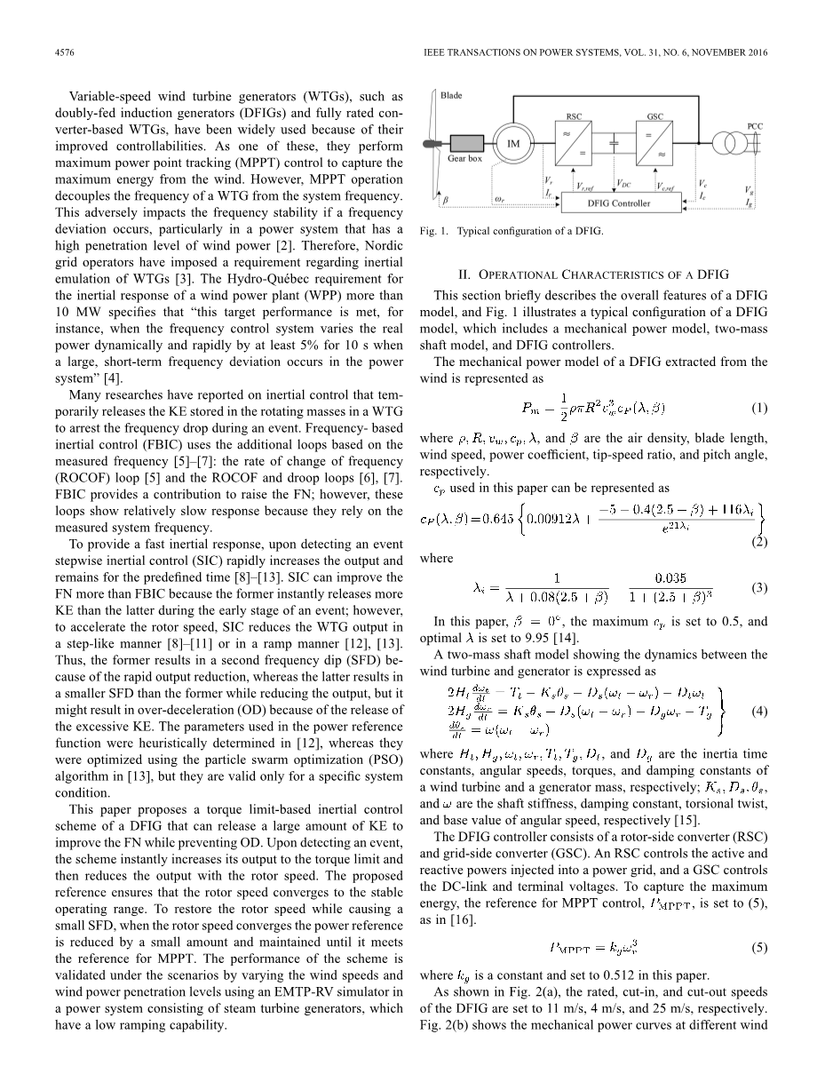 本节简要介绍了双馈感应发电机模型的整体特征, 图1示出了双馈感应发电机模型的典型配置,其包括机功率模型,双质量轴模型和双馈感应发电机控制器。