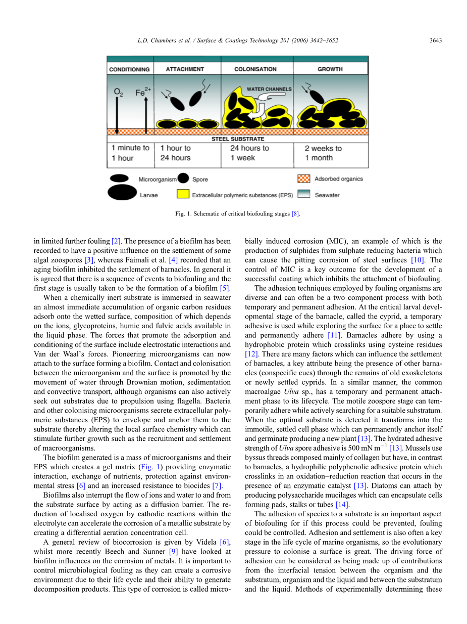 由于更高级污损生物对基质生态位的利用导致污损生物的序列呈不可预测,生物膜的形成往往是大型污染生物污染的先兆。通过去除增加有限污染的初始藻层,实验测试了污损生物的演替[2]。生物膜的存在对一些藻类孢子[3]所产生的积极影响已经被记录,而Faimali等人[4]观察记录到老化的生物膜对藤壶生长有抑制作用。一般来说,生物污染有一个顺序,而第一个阶段则是生物膜的形成。当化学惰性基底沉浸在海水中,有机碳残基几乎立即积累并吸附到湿润表面,其构成取决于液态阶段的离子、糖蛋白,腐殖酸和黄腐酸的作用。促进吸附及表面的调节的力量包括静电相互作用和分子间作用力。首批微生物可以附着在表面形成生物膜。在微生物和表面之间的接触和繁殖由通过布朗运动的水分子运动促进沉淀和运输,虽然生物体也可以利用鞭毛推进寻找基底。细菌和其他殖民微生物分泌胞外多聚—