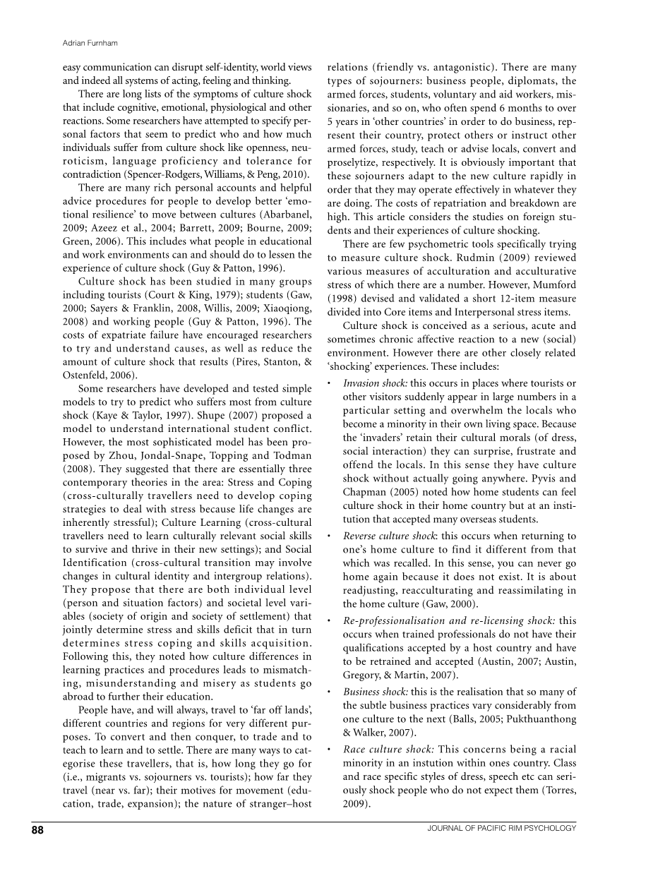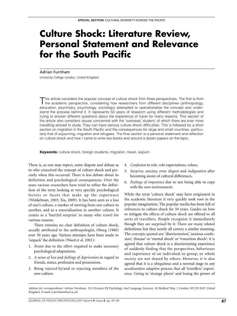 There remains no clear definition of culture shock, usually attributed to the anthropologist, Oberg (1960) over 50 years ago. Various attempts have been made to lsquo;unpackrsquo; the definition (Ward et al. 2001):