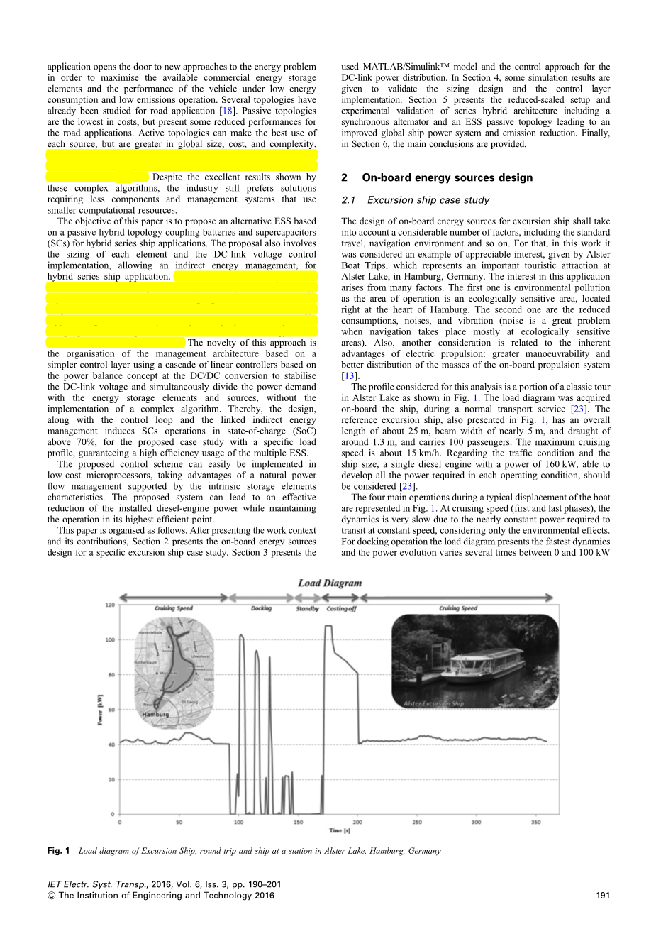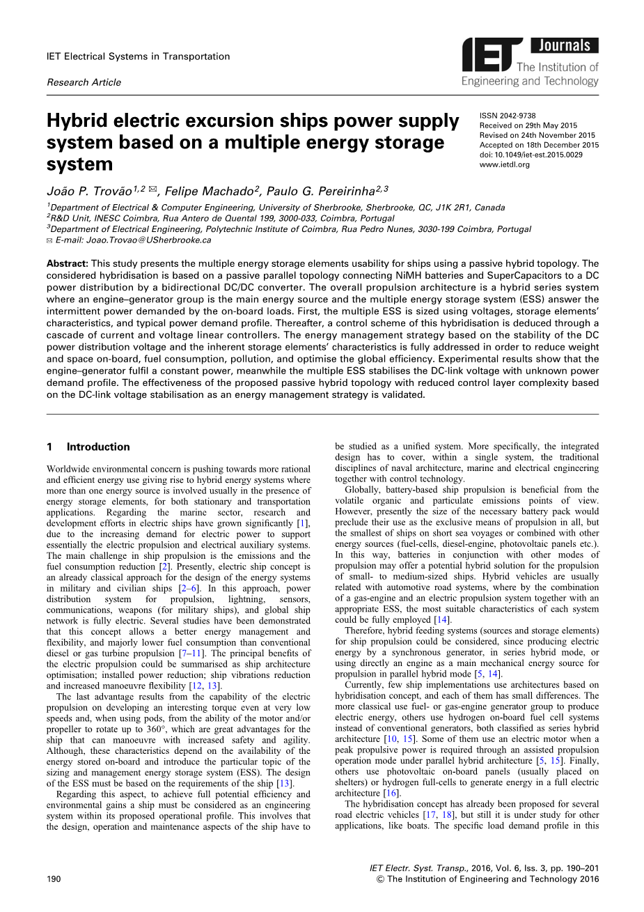 本文的目的是提出一种基于被动混合拓扑耦合电池和超级电容器(SCs)的混合系列船舶应用的替代ESS。该建议还涉及每个元件的尺寸和DC链路电压控制实现,允许间接能量管理,用于混合系列船舶应用。正如Barrade和Rufer [22]所推荐的,基于SCs的能量能力的高效率可用性是针对电压大于一半的范围,其中SC可以提供其存储能量的75%。接近这种效率概念,所提出的多ESS设计允许在较高电压变化范围内使用50%的SCs存储的能量。该方法的新颖性在于基于更简单的控制层的管理架构的组织,其使用基于DC / DC转换时的功率平衡概念的级联的线性控制器,以稳定DC链路电压并同时将在能量存储元件间划分功率需求,没有复杂的实现算法。因此,对于具有特定负载曲线的所提出的案例研究,设计以及控制回路和相关的间接能量管理导致SCs在高于70%的充电状态(SoC)下的操作,保证了高效率使用多个ESS。