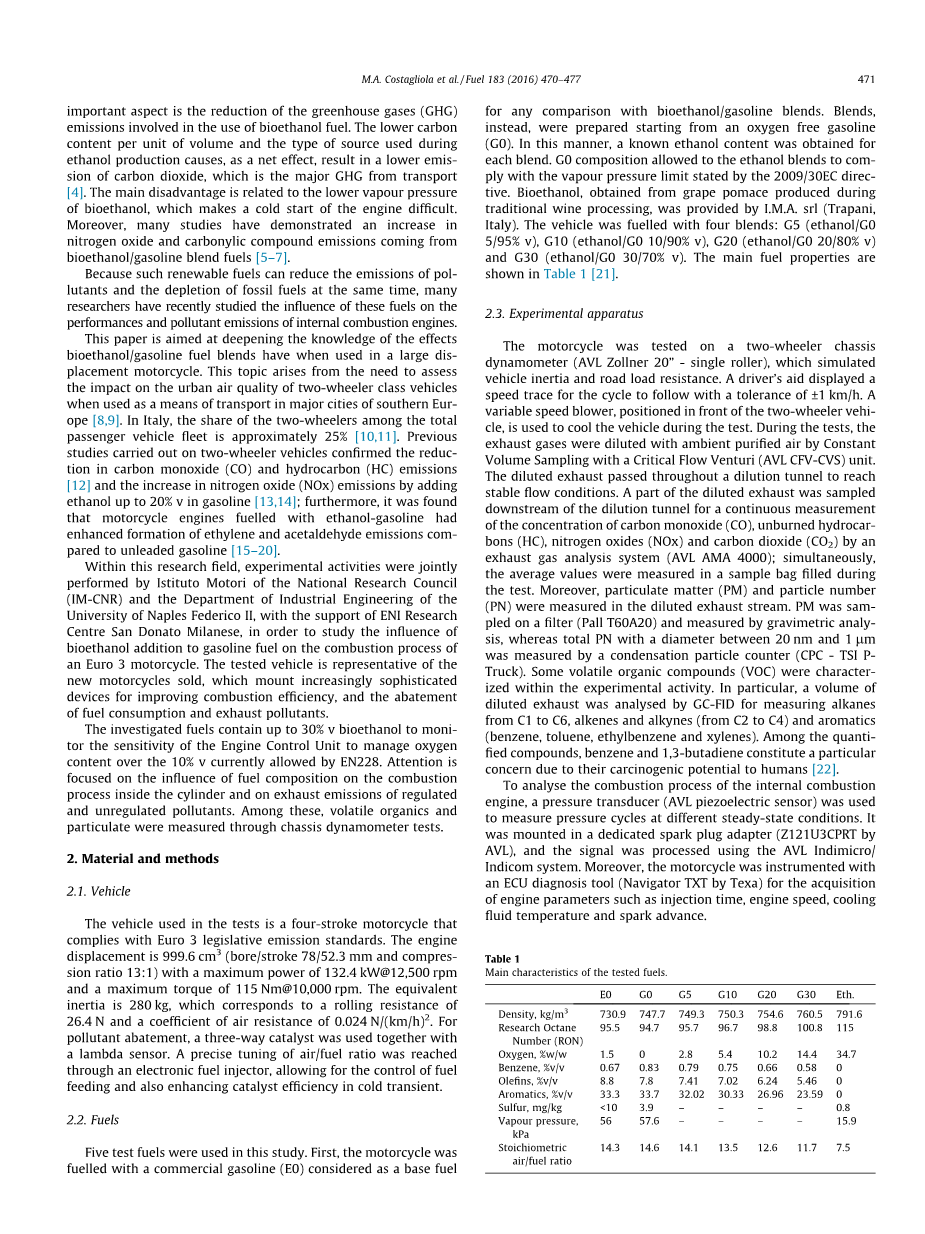 本研究采用五种试验燃料。首先,摩托车用商业汽油(E0),被认为是与生物乙醇/汽油混合物进行比较的基础燃料。相反,混合物是从无氧汽油(G0)开始制备的。以这种方式,获得每种共混物的已知乙醇含量。G0组合物允许乙醇混合物符合2009 / 30EC指令规定的蒸气压限制。由葡萄酒加工过程中生产的葡萄果渣生产的生物乙醇由I.M.A.提供。srl(意大利特拉帕尼)。车辆用四种混合物燃料:G5(乙醇/ G0 5/95%v),G10(乙醇/ G0 10/90%v),G20(乙醇/ G20 / 80%v)和G30(乙醇/ / 70%v)。主要燃料特性如表1所示[21]。