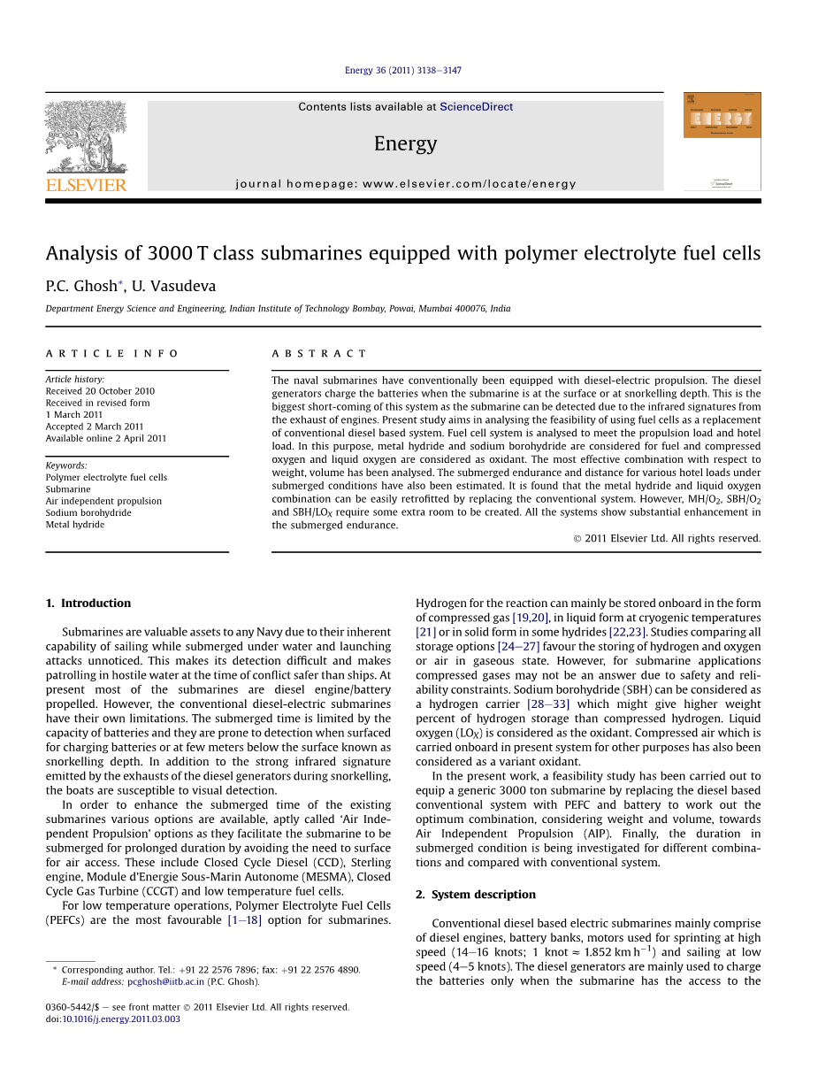 装备有聚合物电解质燃料电池的3000T级潜艇的分析外文翻译资料