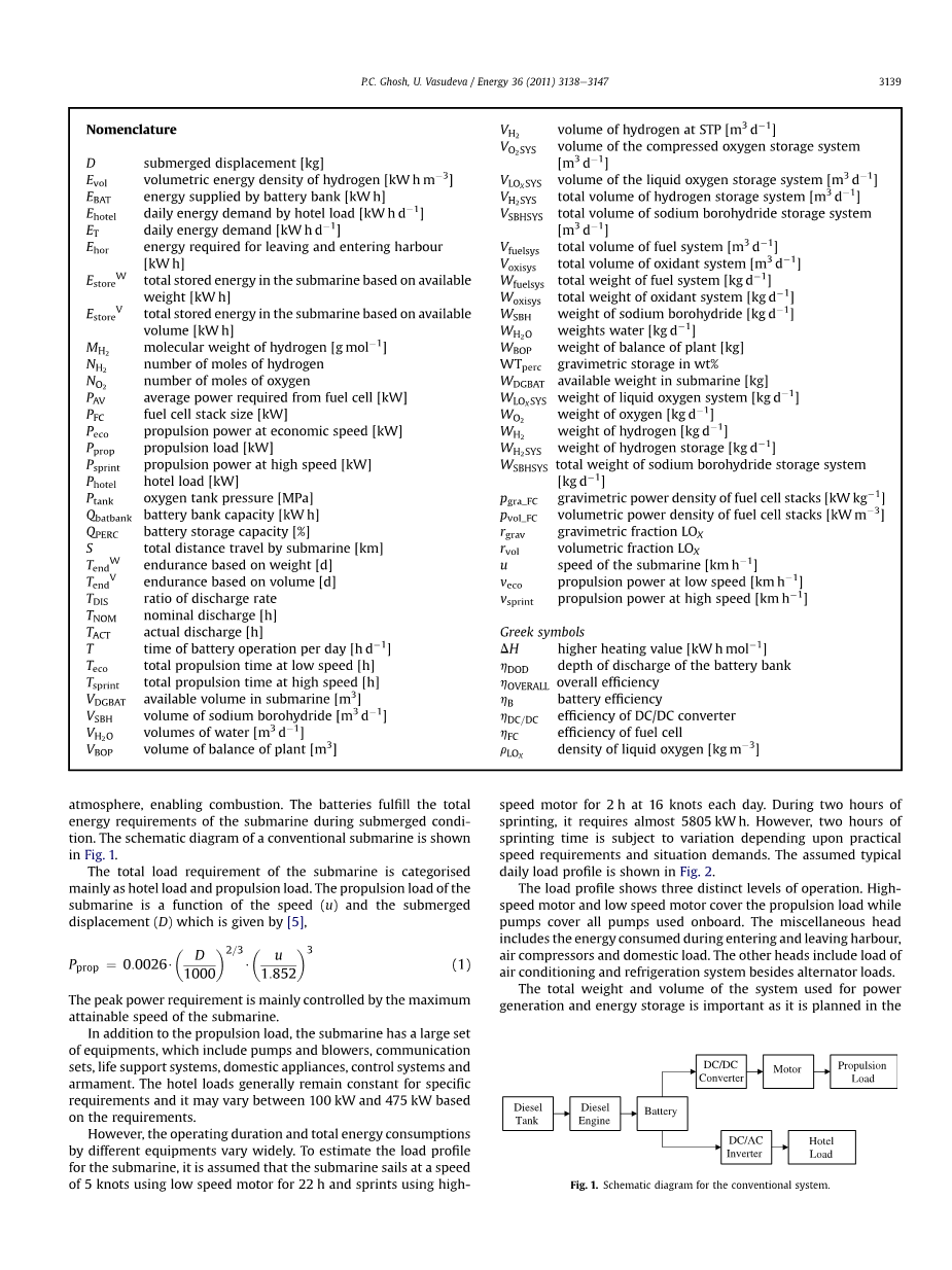 然而,对于本方法中的潜艇来说,基于燃料电池系统的使用取决于替代传统的基于柴油电池的混合动力系统后系统的可用体积和重量。无论存储系统如何,满足总能源需求()所需的氢氧化合物总量是由下式给出: