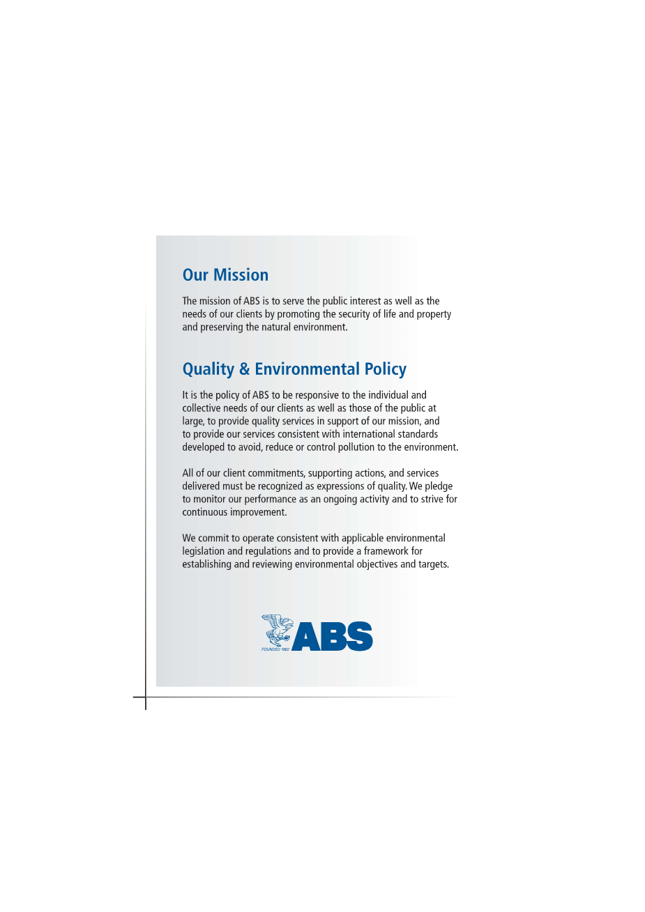 ABS的政策就是要对个人、集体以及广大群众的需求负责任,在提供高质量服务以支持使命上负责,在提供与被逐渐发展以避免、减少和控制环境污染的国际标准一致的服务上负责。