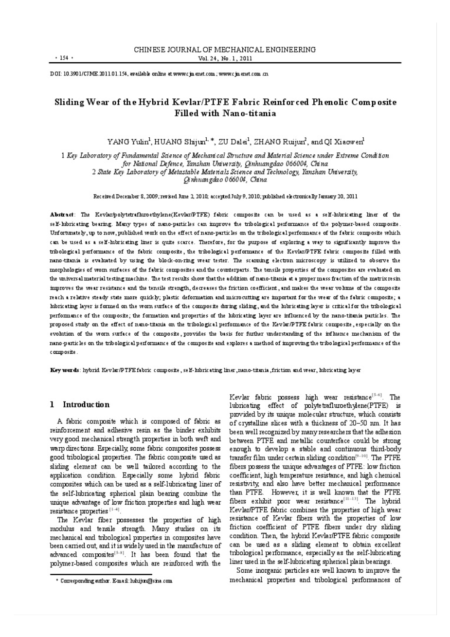 关键字:芳纶/ PTFE复合材料, 自润滑衬垫,纳米二氧化钛,摩擦和磨损,