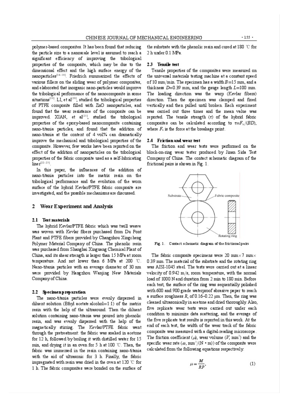 用芳纶纤维编制的斜纹组织混合芳纶/聚四氟乙烯织物采购于杜邦工厂,聚四氟乙烯纤维和由中国常州兴城高分子材料有限公司提供。酚醛树脂选购于中国上海新光化工厂,室温下其抗剪强度大于15 Mpa。200°C时不低于6 MPa。平均直径为30 nm的纳米二氧化钛颗粒由中国杭州万景新材料公司提供。