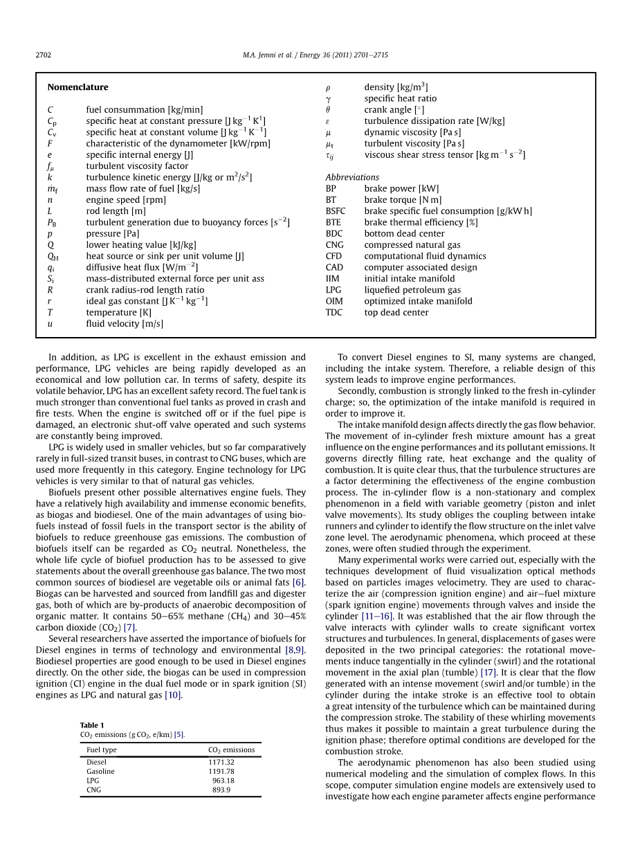 柴油发动机,特别是卡车和公共汽车上所用的,造成了许多经济和生态问题。柴油机所排放的废气是世界上大多数城市大气主要污染源之一。此外,由于原油价格上涨,使得传统柴油机的前景黯淡,而使用代用燃料(LPG液化石油气,CNG压缩天然气)成为主要的解决办法之一。发动机缸内燃烧与缸内气体流动有关,气体的流动直接受进气系统尤其是进气歧管的影响。本文通过数值模拟和实验的方法研究了双进气道柴油机的进气道设计对缸内气体流动的影响。实验所用发动机为Sfax公交车上所搭载的IVECO 13.8L重型柴油机。该发动机改装为双燃料火花点火发动机。1号进气歧管不是特定的形状,2号进气歧管为特定优化几何形状。